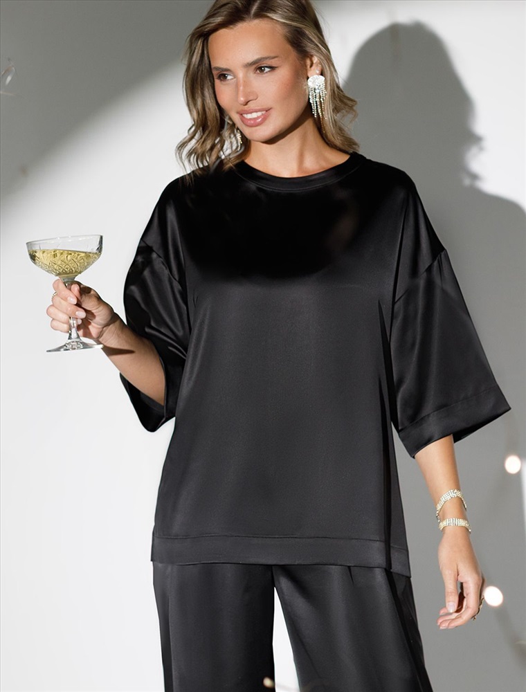 Плотность: 190 Г/м2 Блузка с короткими рукавами черного цвета из струящегося плотного сатина создана для ценительниц комфорта и элегантности. Материал отличается высокой плотностью, что делает блузку устойчивой к износу и сохраняет аккуратный внешний вид даже при длительном использовании. Струящаяся ткань элегантно ложится по фигуре, подчеркивая достоинства силуэта без лишней утяжеленности, в тоже время приятно ощущается на теле. Свободный крой блузки и спущенная линия плеча дарят ощущение легкости и непринужденности, делая образ одновременно женственным и современным. Широкие рукава средней длины гармонично дополняют образ и идеально подходят для полных рук, обеспечивая комфорт, свободу движений и уверенность. Аккуратная застежка на маленькую пуговицу добавляет утонченности, а круглый вырез красиво обрамляет шею, создавая аккуратную линию декольте. Блузка смотрится нарядно благодаря сочетанию мягкой текстуры сатина и его мягкого не вычурного блеска. Такая повседневная блузка легко впишется в деловой гардероб или станет отличным выбором для вечерней встречи с друзьями. Она гармонично сочетается с юбками, брюками или джинсами — вы сможете создать множество вариантов нарядов на каждый день или подобрать подходящий лук для особого случая, праздника или Нового года. Комментарии к товару
