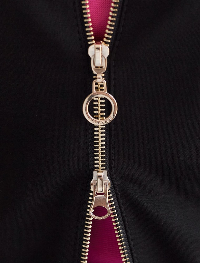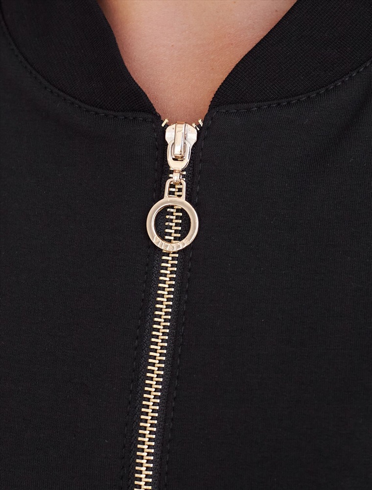 Стильный бомбер черного цвета на молнии среднего объема выполнен из премиального футера двухнитки без начеса, обеспечивает мягкость и комфорт при носке. Эластичный материал отличается дышащими свойствами, позволяя коже свободно дышать в течение дня. Качественная фурнитура гарантирует долговечность и удобство использования. Повседневный бомбер имеет аккуратный ворот и широкую резинку по низу, а также манжеты на рукавах, которые надежно фиксируют изделие и сохраняют тепло.. По бокам расположены прорезные карманы удобные для хранения необходимых мелочей или рук в прохладную погоду. Бомбер дополнен металлическим логотипом бренда. Полуприлегающий крой создает уютный образ и подходит для любого роста и размеров.