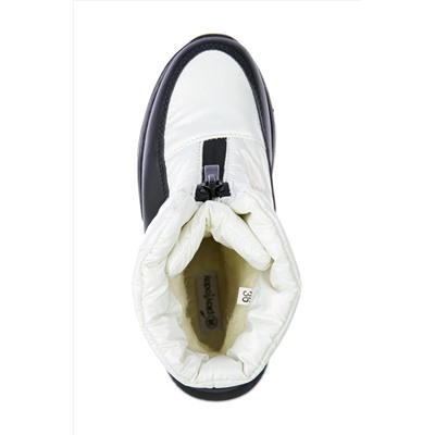 Верх обуви выполнен из искусственной кожи и текстильного материала с водоотталкивающим покрытием. Подкладка и стелька из шерстяного меха 80%. Формоустойчивый задник поддерживает стопу в правильном положении. Застежка на молнию. Глухой клапан в области застежки защищает от проникновения влаги внутрь. Подошва имеет противоскользящий протектор. Съемная стелька позволяет хорошо просушить обувь после прогулки. Рекомендованный температурный режим от 0°С до -15°С.