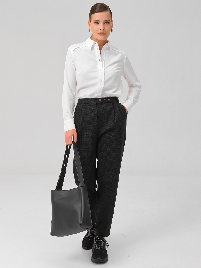 Коллекция: Базовая Сезон: Осень-Зима Ткань: Трикотаж Подклад: Нет Силуэт: Зауженные к низу Посадка: Средняя Карманы: В подрезных бочках Пояс: Подкройной Застежка: Молния, кнопка на поясе Длина изделия в росте: 164- 42р – 101см, 54р – 102см. Ширина брюк по низу: 42р – 16,5см; 54р – 19,5см. Состав ткани: Шерсть 10% Вис 55% ПЭ 33% Эласт 2% Рост модели на фото: 174 Размер модели на фото: 44 Брюки трикотажные. Модель зауженная к низу. Пояс подкройной. Застёжка на молнию, пуговицу и кнопку на поясе. Спереди карманы в подрезных бочках, защипы и декоративные кнопки на поясе. Комментарии к товару