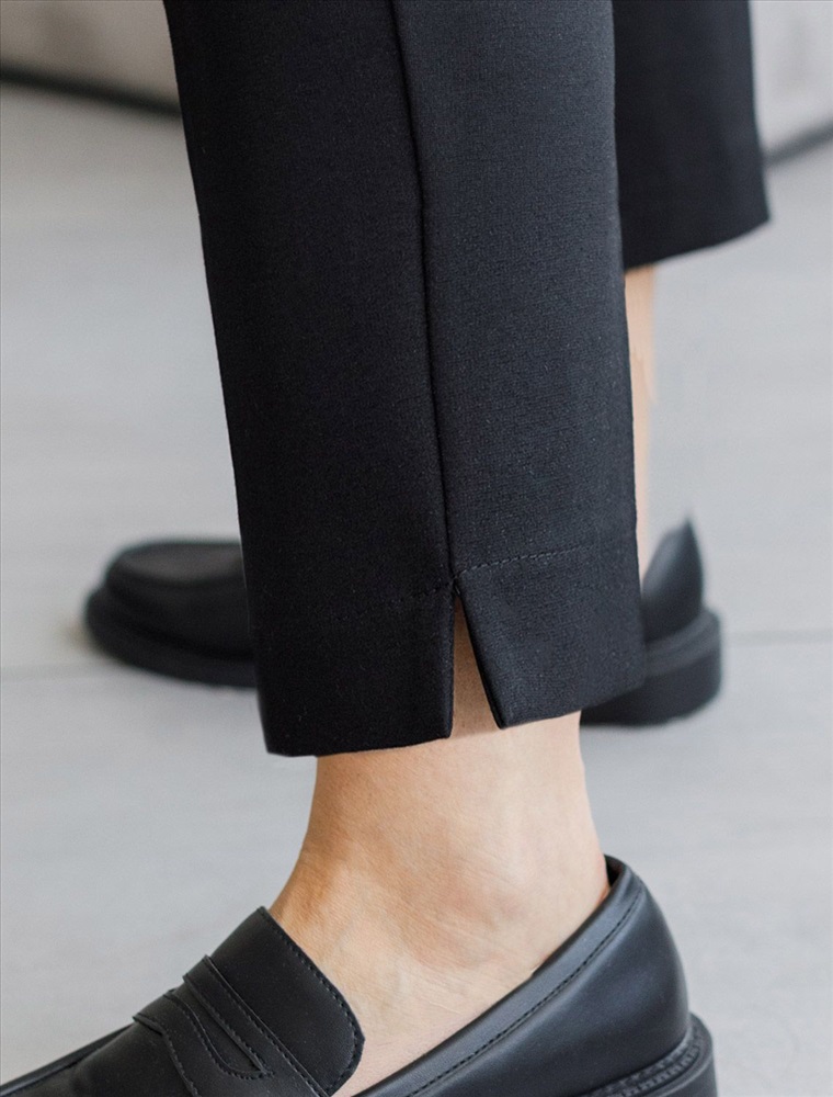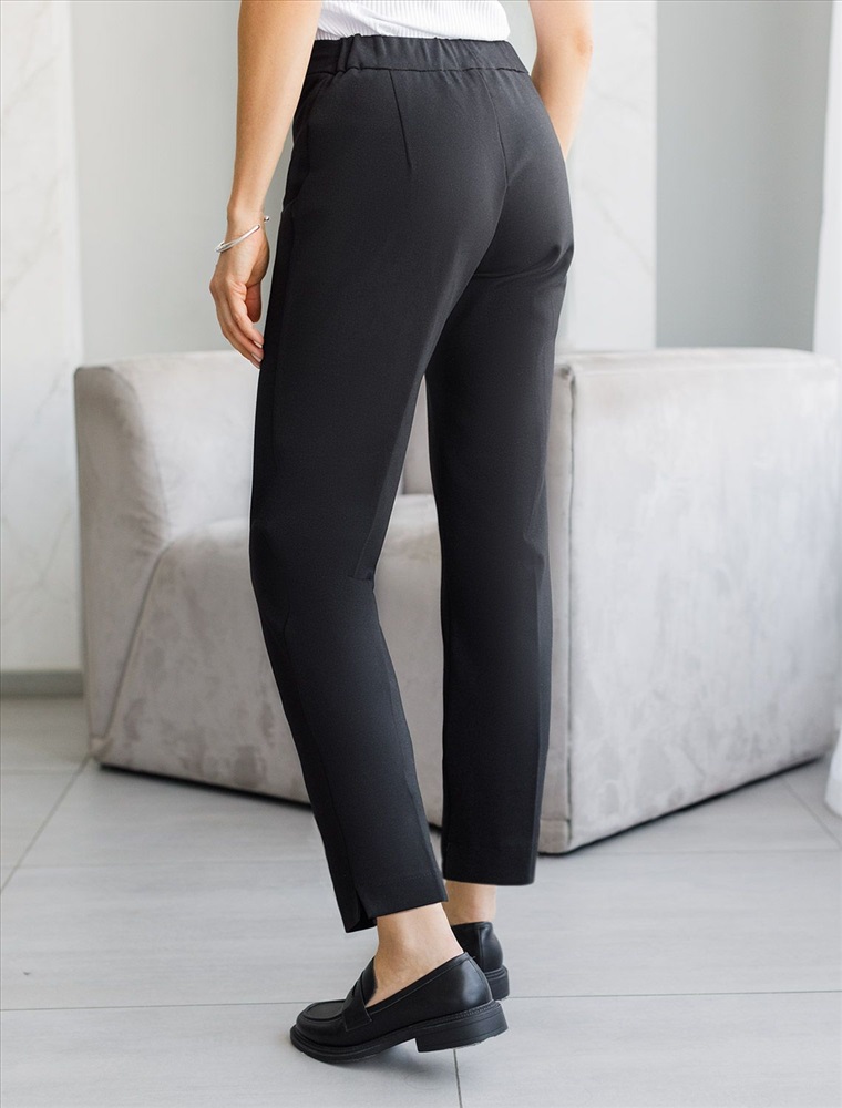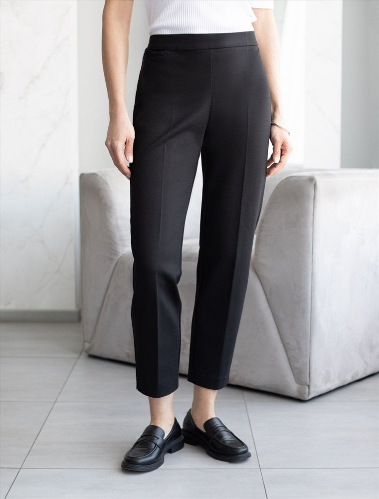 Размер товара на первом фото: 42 Брюки-дудочки выполнены из джерси. Модель дополнена резинкой сзади, одним вместительным карманом спереди и небольшими боковыми разрезами. Заутюженные стрелки и посадка на талии визуально вытягивают силуэт. Изделие хорошо держит форму, отлично тянется и почти не мнется во время использования. Идеальный вариант в офис или в повседневный классический стиль. Комментарии к товару