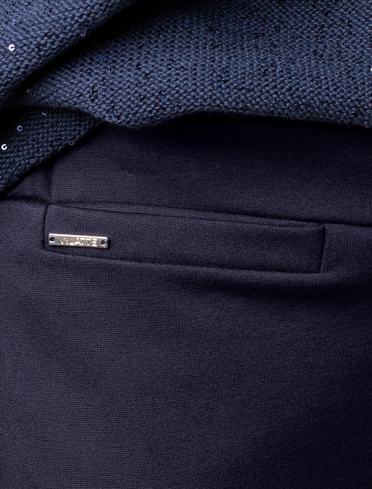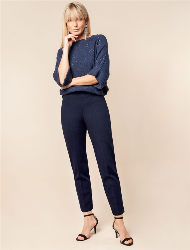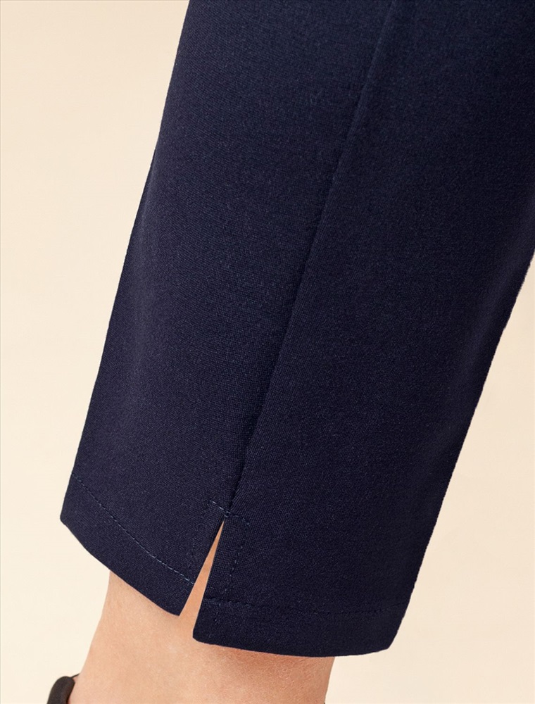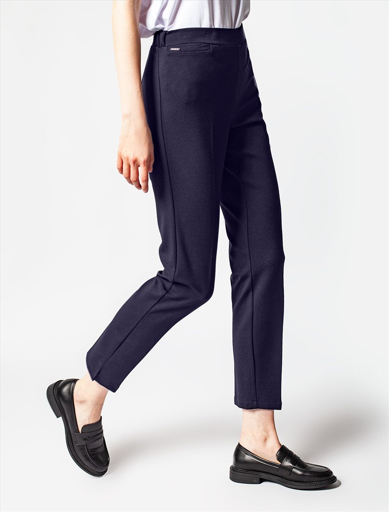 Брюки "дудочки" выполнены из плотного джерси. Высокая посадка зрительно увеличивают рост и визуально стройнит. Модель дополнена сзади эластичным поясом на резинке и боковыми разрезами по низу штанин. Одним кармашком спереди. Лаконичные брюки станут идеальным дополнением базового гардероба. С легкостью дополнят строгий офисный стиль и праздничный образ.