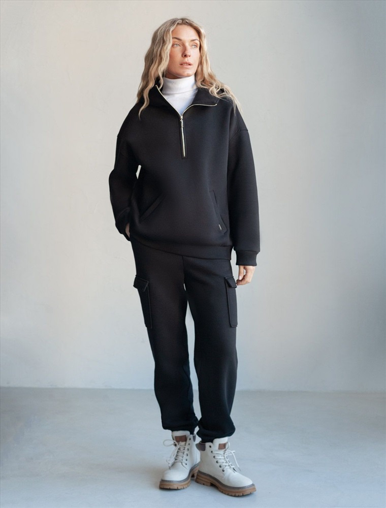 Практичные и комфортные свободные джоггеры черного цвета отлично подойдут для активного отдыха и повседневных прогулок. Теплые джоггеры выполнены из футера трехнитки с мягким начесом, обеспечивающего тепло и уют в прохладную погоду. Эластичная резинка на поясе гарантирует удобную посадку и свободу движений, а зауженные штанины создают современный стильный силуэт. Подойдут женщинам на любую фигуру, на объемные и женственные формы или на худеньких девушек, а так же на высокий или низкий рост, благодаря универсальной длине. Натуральный материал отличается высокой износостойкостью, поэтому штаны сохранят презентабельный вид даже после долгого периода активной носки.