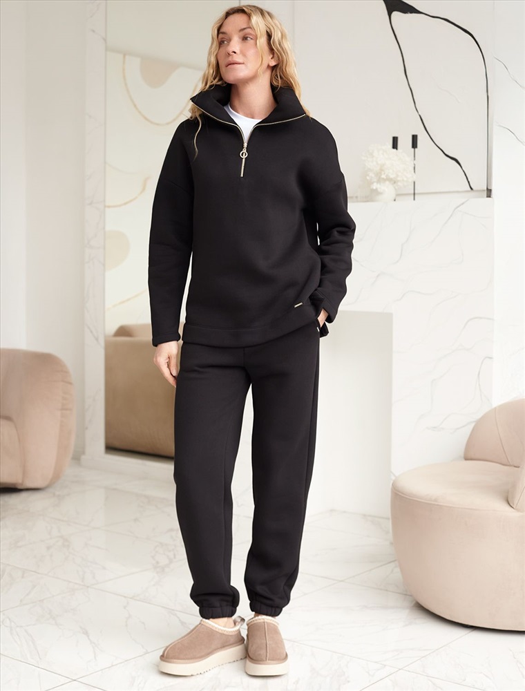 Эти уютные брюки черного цвета созданы для вашего комфорта. Стильные спортивные штаны из натурального материала и правильного кроя подойдут для девушек и женщин любого размера, в том числе на плюс-сайз фигуру. Зауженные к низу брюки отлично вытянут силуэт и скроют недостатки за счет правильного кроя.
