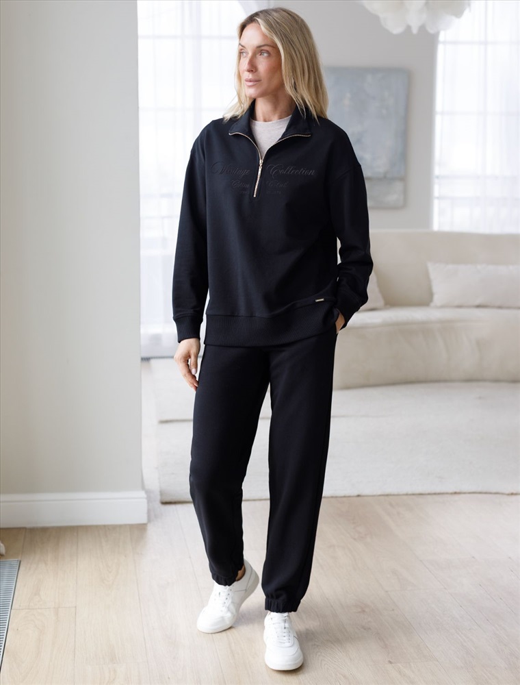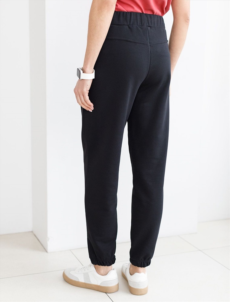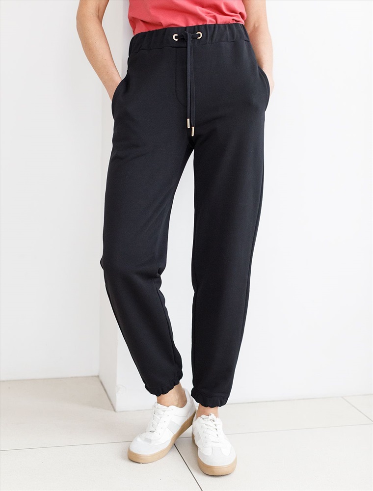 Брюки выполнены из премиального футера трехнитки без начеса. Модель дополнена эластичным поясом на резинке и хлопковым шнурком с золотистой фурнитурой. По бокам два кармана. Наличие эластана в составе гарантирует формоустойчивость и износостойкость изделия. Изделие сочетается в костюме с худи D49.050