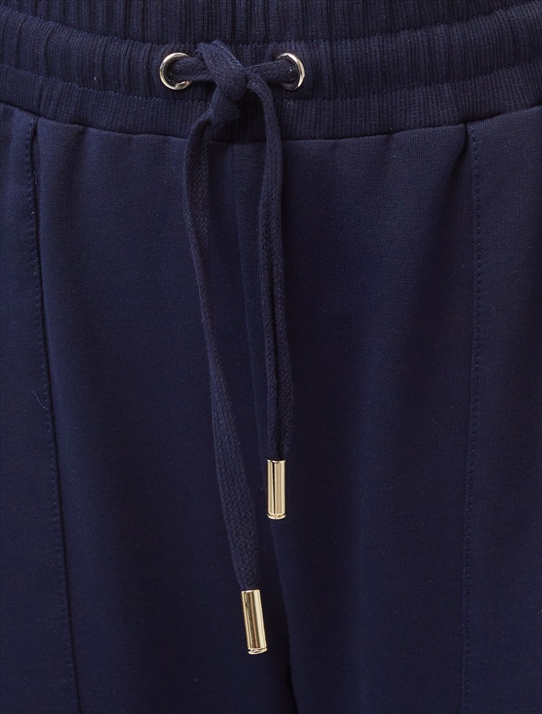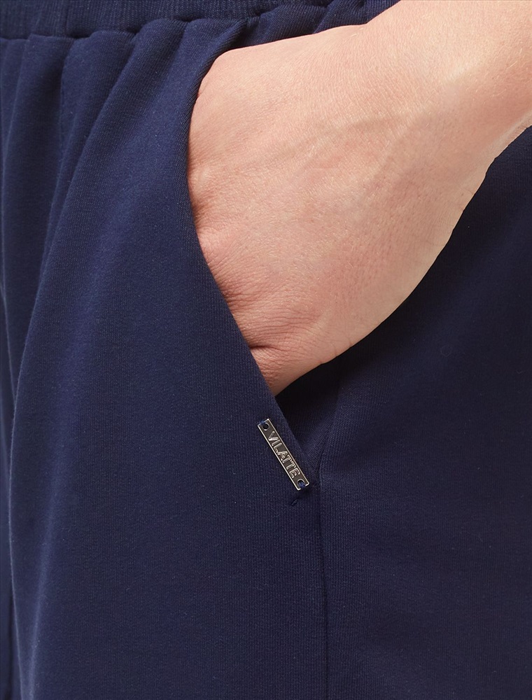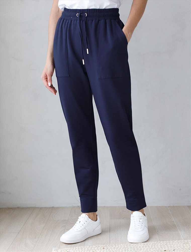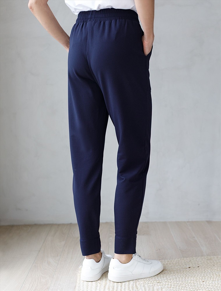 Брюки выполнены из футера двухнитки с эластаном. Модель зауженная к низу дополнена карманами и эластичным поясом с фактурой в рубчик. В пояс вставлен плоский хлопковый шнур в тон изделия с золотистыми наконечниками. Изделие дополнено металлическим логотипом бренда. Сочетается в костюме с жакетом D49.078, джемпером D49.079, D49.080 и футболкой D49.081