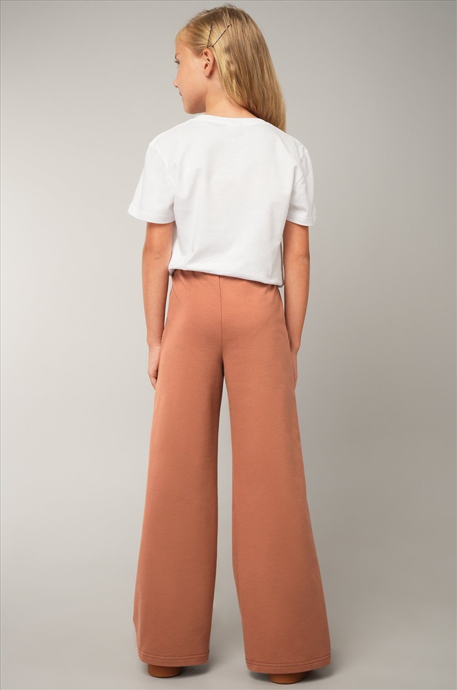 Преимущества: – плотный футер двухнитка с добавлением лайкры (240 г/м2); – приятный на ощупь трикотажный хлопок; – прямой крой и широкие штанины; – удобный пояс на резинке для комфортной посадки; – функциональные карманы. Широкие штаны палаццо цвета мокко подойдут как на каждый день, так и для дома, создавая аккуратный и стильный образ. Лаконичный фасон базовых детских брюк всегда остается удобным и современным. Рост модели 140 см, параметры: объем груди 59, объем талии 50, объем бедер 65 см. На ней размер 134.