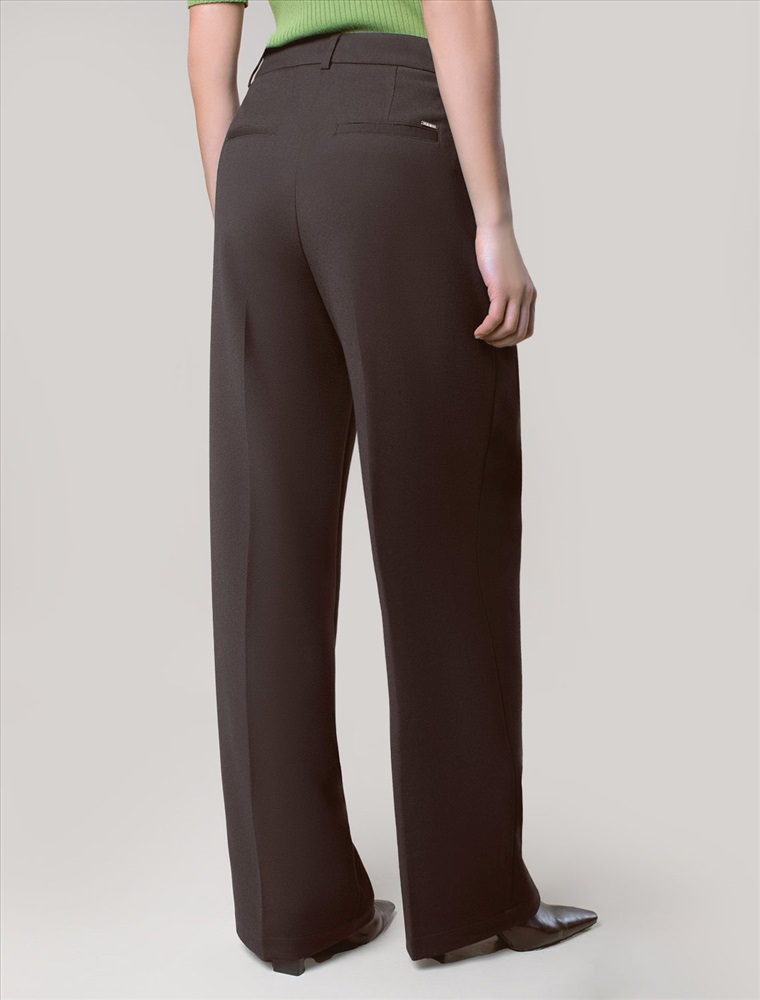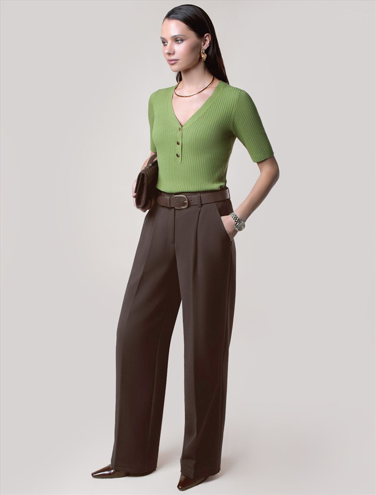 Брюки-палаццо выполнены из эластичной поливискозы. Легкая и струящаяся ткань идеально подойдет для повседневных образов. Модель с высокой посадкой визуально стройнит и вытягивает силуэт, удлиняет ноги. По верхнему краю спереди классически заложены складки, что придает свободы и простора в районе бедер. Свободный силуэт подходит для любой фигуры.