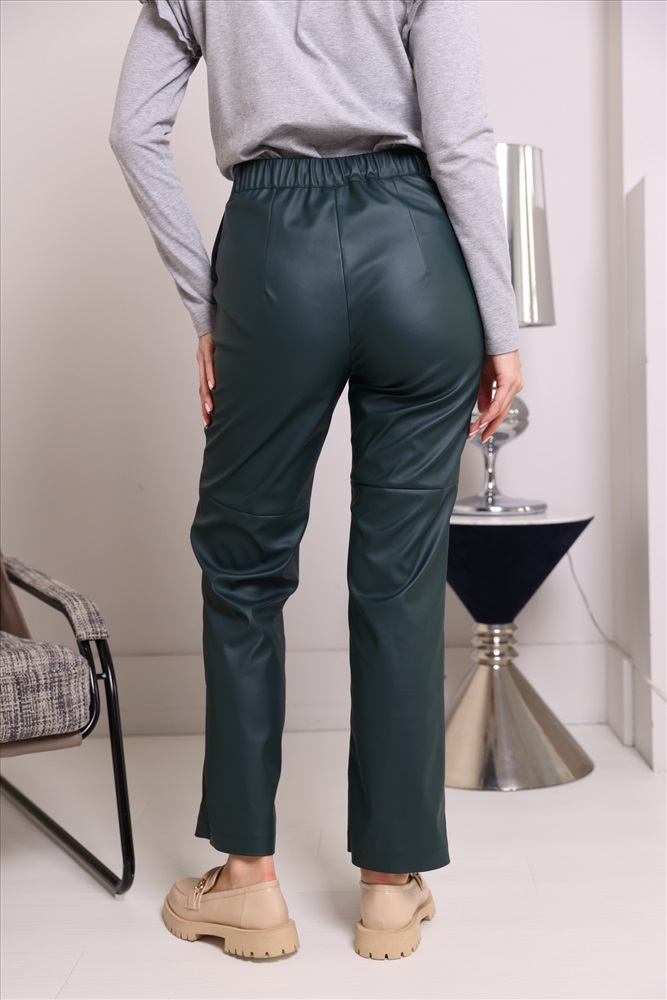 Брюки прямые из экокожи с притачным поясом на резинке по спинке. Карманы в боковых швах, застежка на молнию и 2 крючка. Брюки комбинированного кроя.