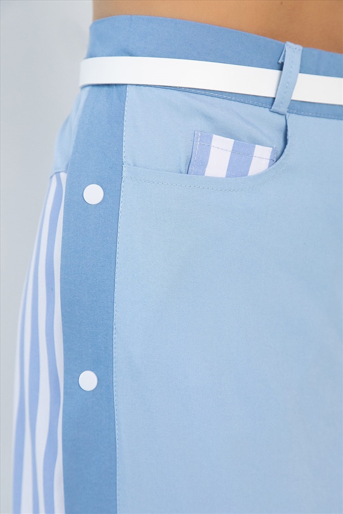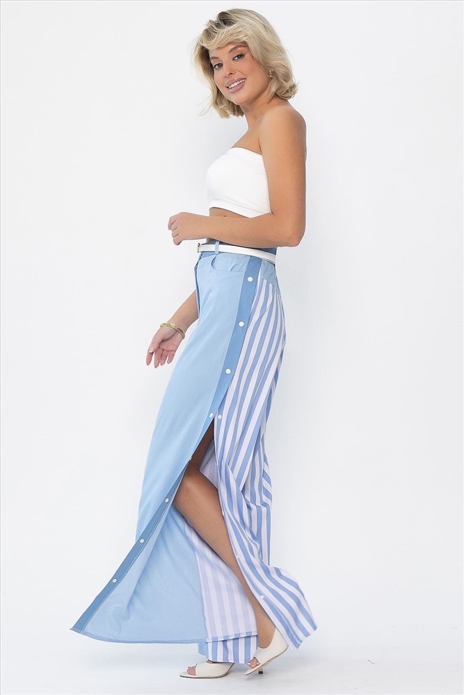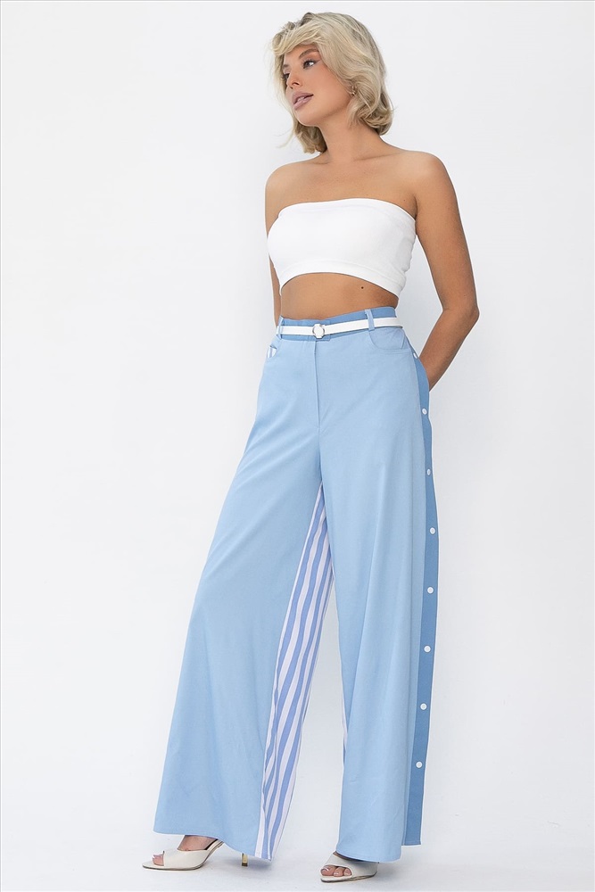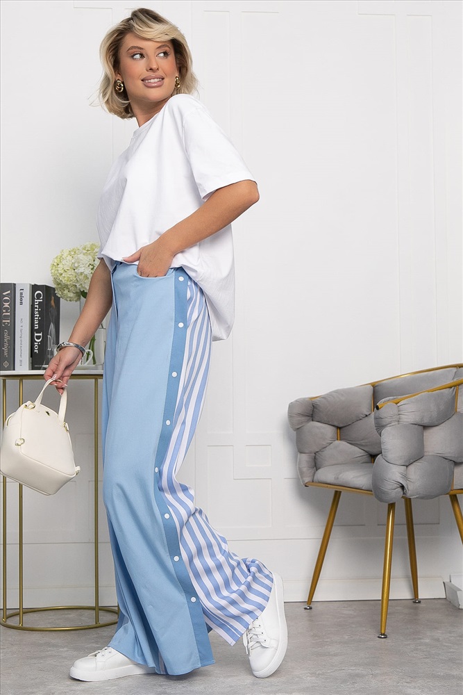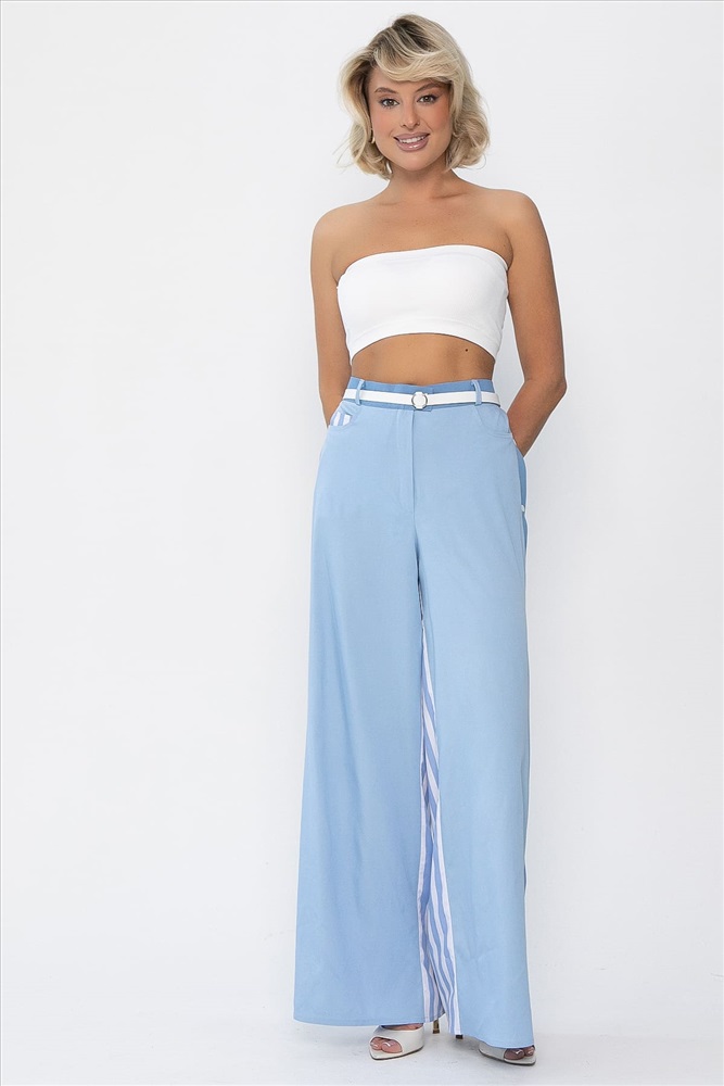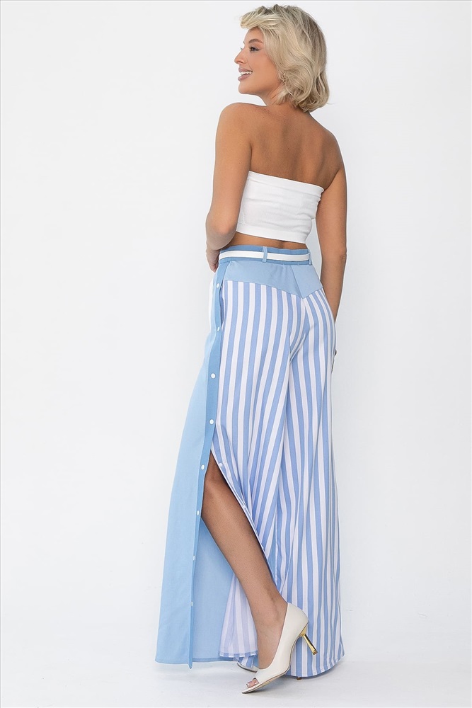 Женские брюки полуприлегающего силуэта на притачном поясе с застёжкой-гульфиком, длина брюк до щиколотки. Пояс находится на естественной линии талии. Передние половинки с карманами с подрезным бочком, а также одним накладным маленьким кармашком. По боковым срезам джинсов застёжки на кнопки. Задняя часть джинсов выполнена из джинсы с принтом в полоску.