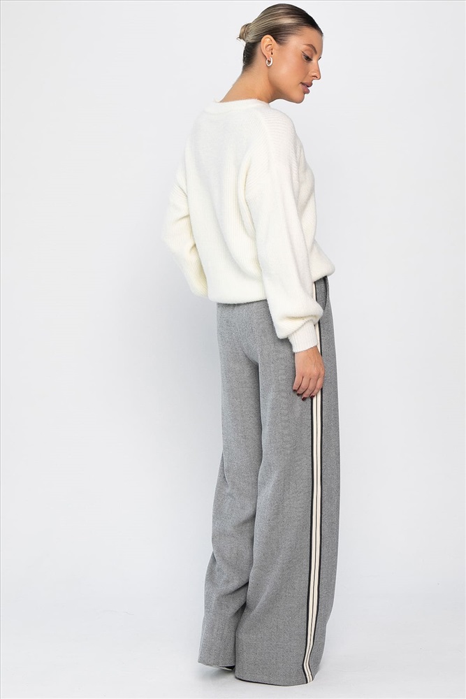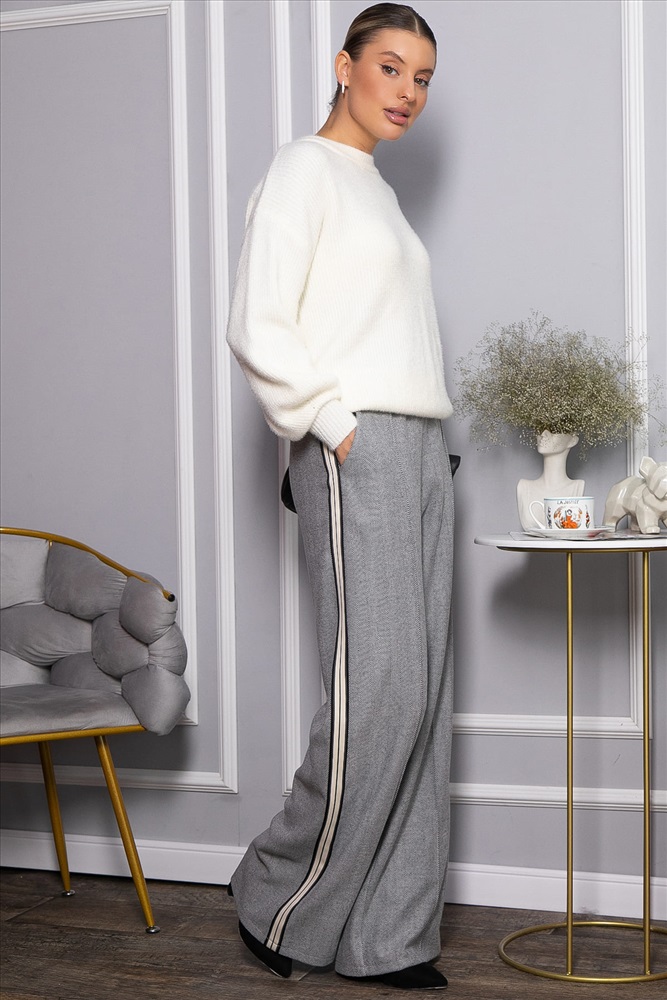 Стильные брюки палаццо с широкой свободной посадкой обеспечивают максимальный комфорт и элегантность. Эластичная резинка на поясе гарантирует удобную посадку, а практичные боковые карманы добавляют функциональности. По бокам брючин проходят контрастные лампасы, которые придают модели модный спортивный акцент и визуально удлиняют силуэт. Идеальный выбор для создания стильных и комфортных образов на каждый день.