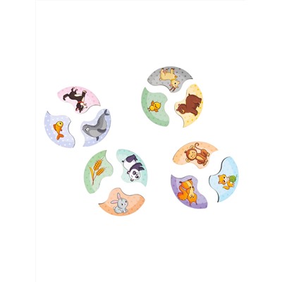 Как играть? Объясните ребенку принцип сборки пазла. Подбирайте пазлы по цвету и по дополняющим картинкам. Например, курочка - мама, ее малыш - это цыпленок, колосья с зернышками - их еда. Установите пазлы так, чтобы они совпали друг с другом.