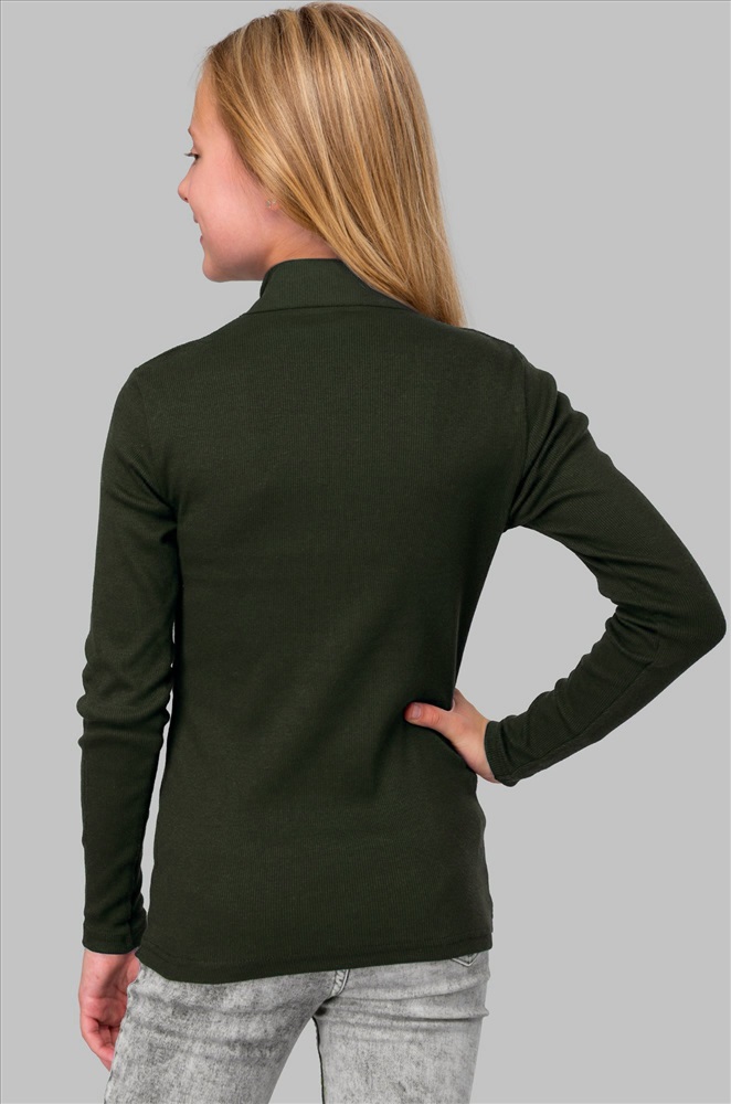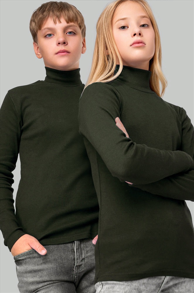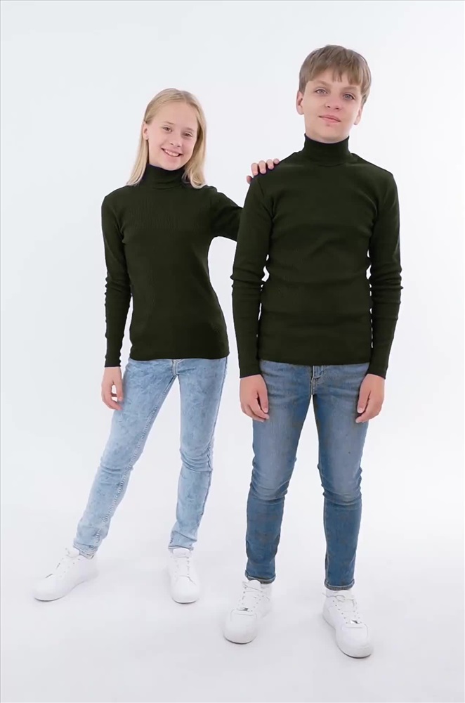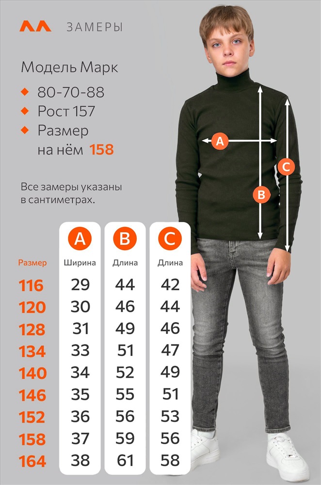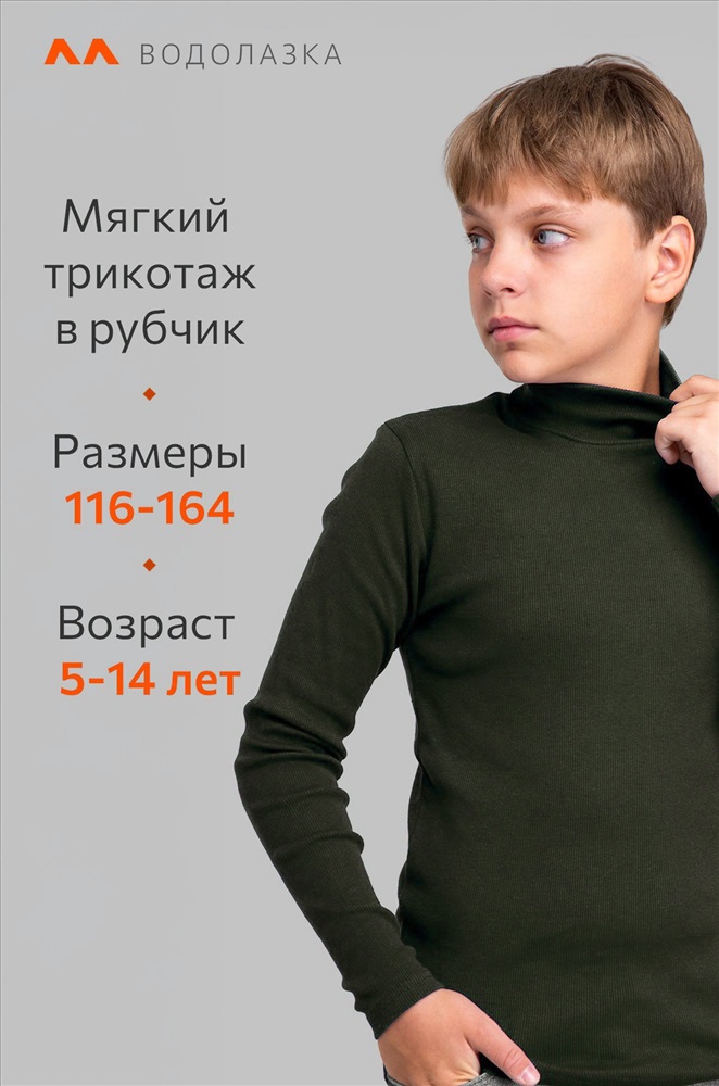 Преимущества: — натуральный хлопок с эластаном — мягкость, комфорт и долговечность; — фактурный трикотаж кашкорсе — приятная посадка по фигуре; — прямой крой и длинные рукава — свобода движений на весь день; — демисезонная водолазка имеет высокий воротник-стойку, который защищает от холода и смотрится стильно; — цвет хаки подойдёт и девочкам, и мальчикам; — детский бадлон универсален: подойдет для школы и для прогулок. Однотонная зеленая водолазка легко впишется в повседневный гардероб осенью и весной. Базовая водолазка хорошо сочетается с любым низом и подойдет для многослойных весенних и осенних образов. Мальчик, его рост 157 см, параметры: 80-70-88 см. На нем размер 158. Девочка, ее рост 150 см, параметры: 70-60-73 см. На ней размер 152.