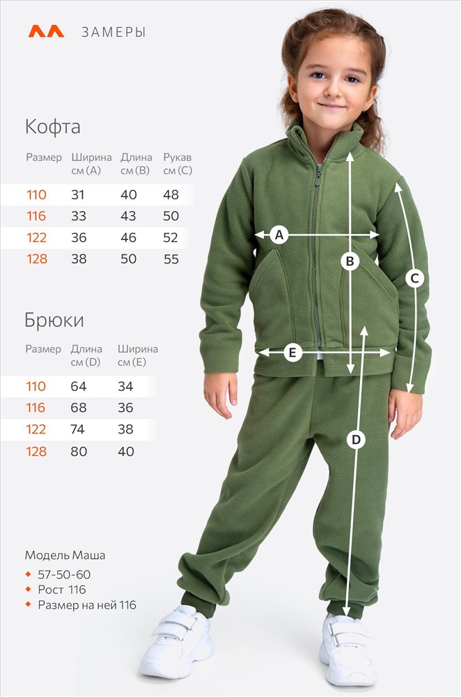 Размер 116: кофта: длина:43 см; ширина:33 см; длина рукава внешняя:50 см; длина рукава внутренняя:33 см.