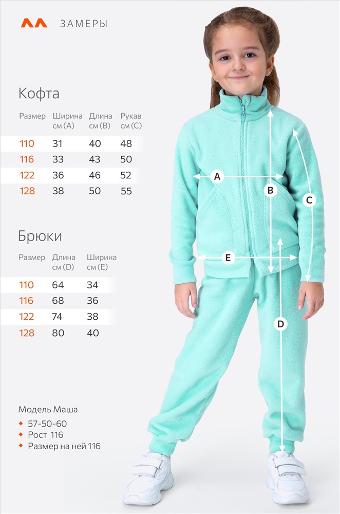 брюки: длина внеш. шва:64 см; длина внут. шва:42 см; ширина по бёдрам:34 см. Размер 116: кофта: длина:43 см; ширина:33 см; длина рукава внешняя:50 см; длина рукава внутренняя:33 см. брюки: длина внеш. шва:68 см; длина внут. шва:46 см; ширина по бёдрам:36 см. Размер 122: кофта: длина:46 см; ширина:36 см; длина рукава внешняя:52 см; длина рукава внутренняя:36 см. брюки: длина внеш. шва:74 см; длина внут. шва:50 см; ширина по бёдрам:38 см. Размер 128: кофта: длина:50 см; ширина:38 см; длина рукава внешняя:55 см; длина рукава внутренняя:38 см. брюки: длина внеш. шва:80 см; длина внут. шва:56 см; ширина по бёдрам:40 см. *замеры выборочные, могут незначительно отличаться. Комментарии к товару