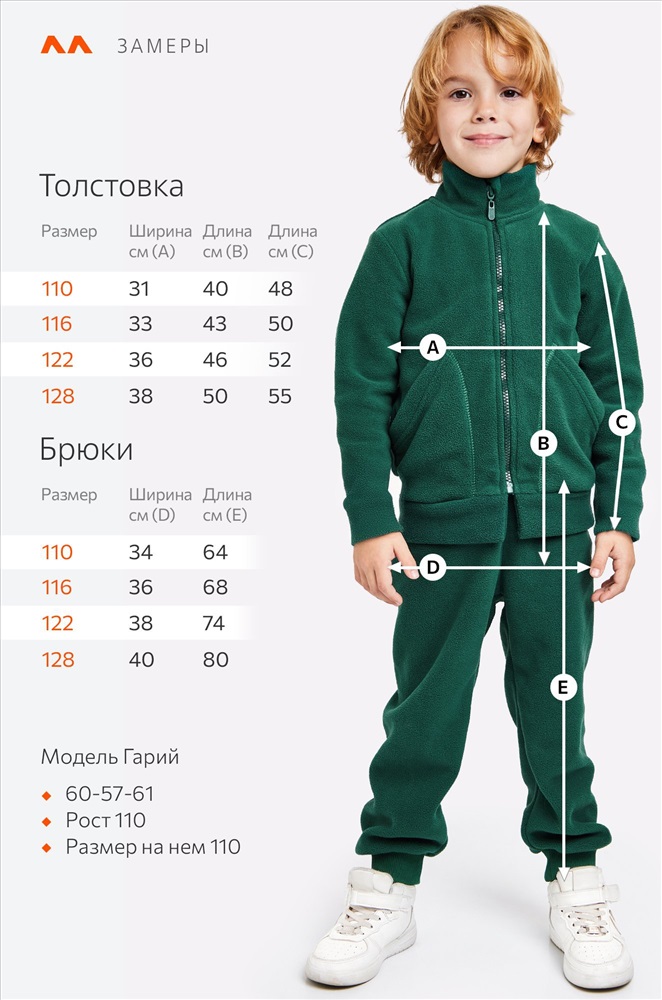 Рост модели 110 см, параметры: объем груди 60, объем талии 57, объем бедер 61 см. На нем размер 110.