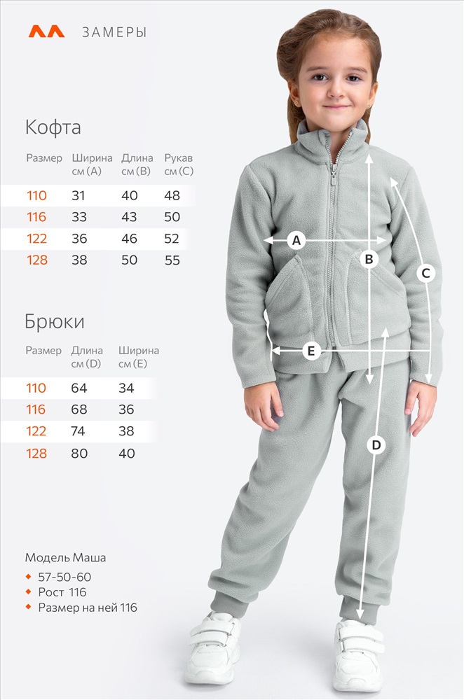 брюки: длина внеш. шва:64 см; длина внут. шва:42 см; ширина по бёдрам:34 см. Размер 116: кофта: длина:43 см; ширина:33 см; длина рукава внешняя:50 см; длина рукава внутренняя:33 см. брюки: длина внеш. шва:68 см; длина внут. шва:46 см; ширина по бёдрам:36 см. Размер 122: кофта: длина:46 см; ширина:36 см; длина рукава внешняя:52 см; длина рукава внутренняя:36 см. брюки: длина внеш. шва:74 см; длина внут. шва:50 см; ширина по бёдрам:38 см. Размер 128: кофта: длина:50 см; ширина:38 см; длина рукава внешняя:55 см; длина рукава внутренняя:38 см. брюки: длина внеш. шва:80 см; длина внут. шва:56 см; ширина по бёдрам:40 см. *замеры выборочные, могут незначительно отличаться. Комментарии к товару