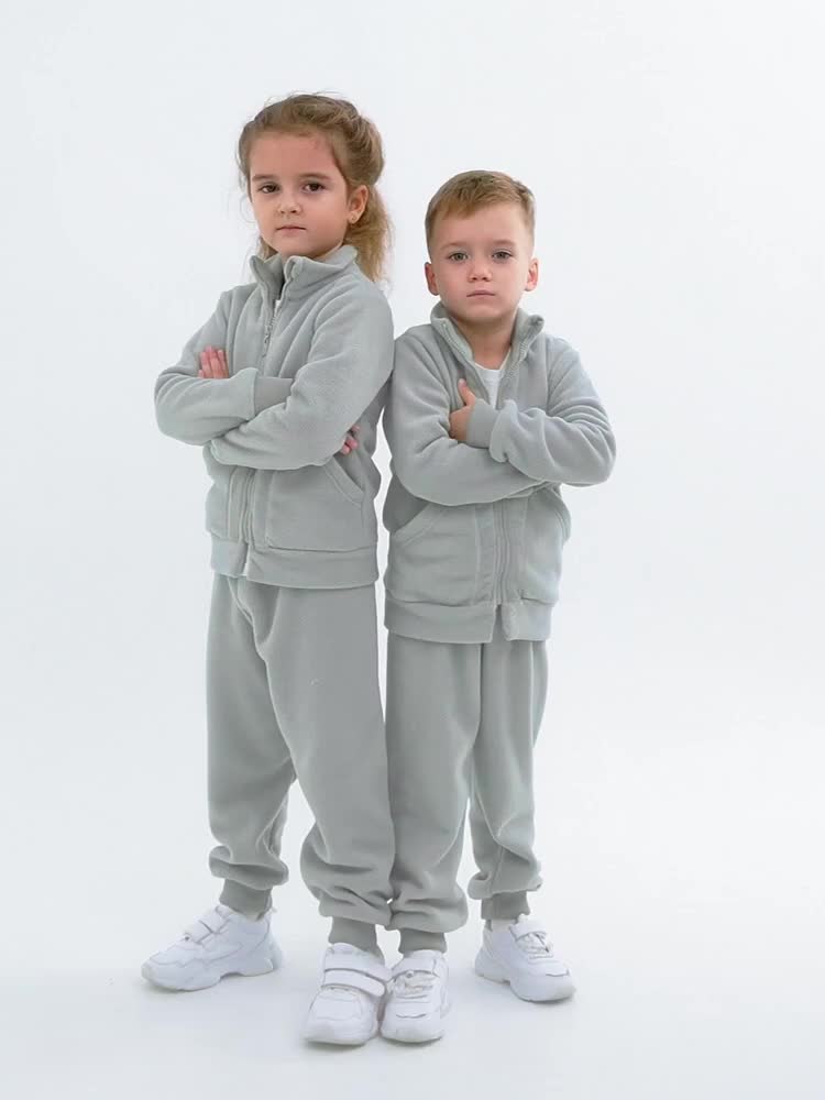 Преимущества: – флисовая ткань надёжно сохраняет тепло; – однотонная базовая модель легко сочетается с любым образом; – спортивный стиль подходит для активных игр; – толстовка с замком (зипка) и карманами добавляет удобства; – штаны на манжетах и с резинкой в поясе удобно сидят по талии. Прямой крой толстовки с воротником-стойкой и свободные брюки делают комплект практичным и уютным. Утепленный спортивный костюм незаменим для детей на осень, зиму и весну — он остаётся комфортным в любой ситуации, его можно носить как поддёву. Размерный ряд позволяет подобрать костюм на флисе для детей 4-8 лет. Рост девочки 116 см, параметры: объем груди 57, объем талии 50, объем бедер 60 см. На ней размер 116. Рост мальчика 110 см, параметры: объем груди 55, объем талии 53, объем бедер 56 см. На нем размер 110.