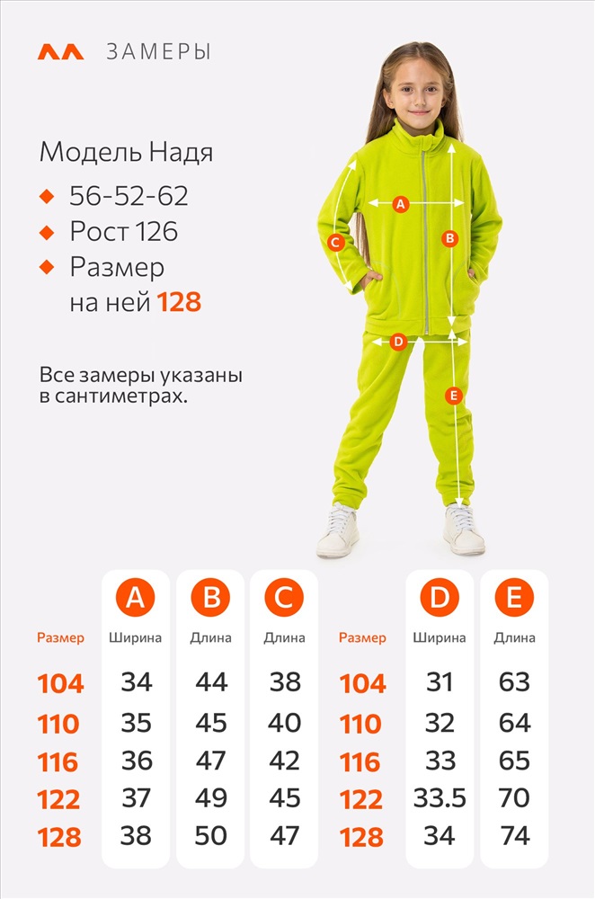 Девочка, рост модели 126, параметры: объем груди 56, объем талии 52, объем бедер 62. На ней размер 128.