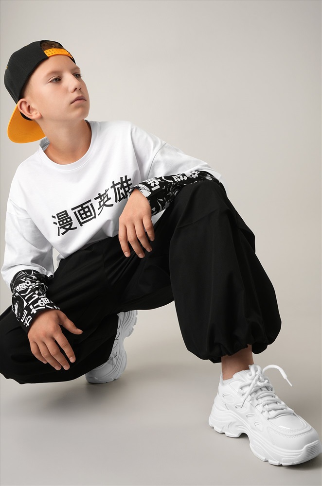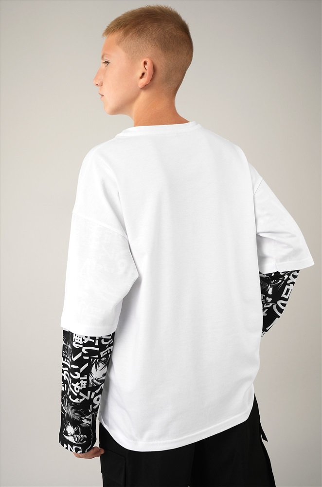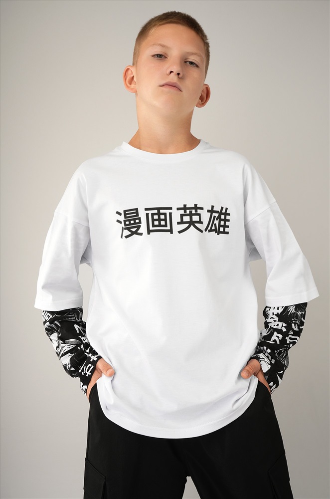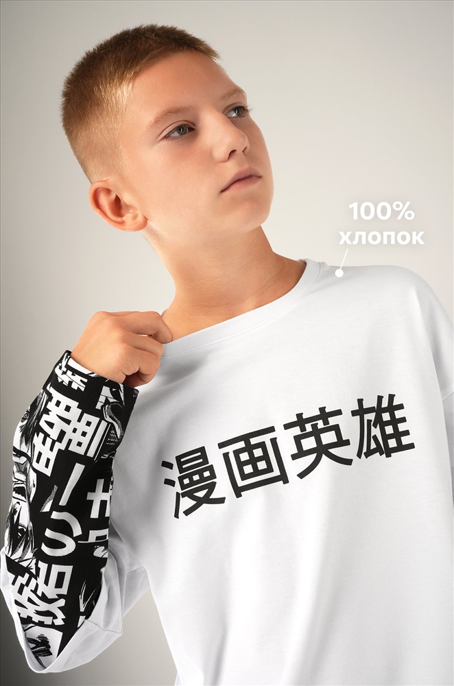 Белый лонгслив с принтом в стиле аниме для мальчиков и мальчиков подростков — выбор для тех, кто ценит свободу и уличную эстетику.