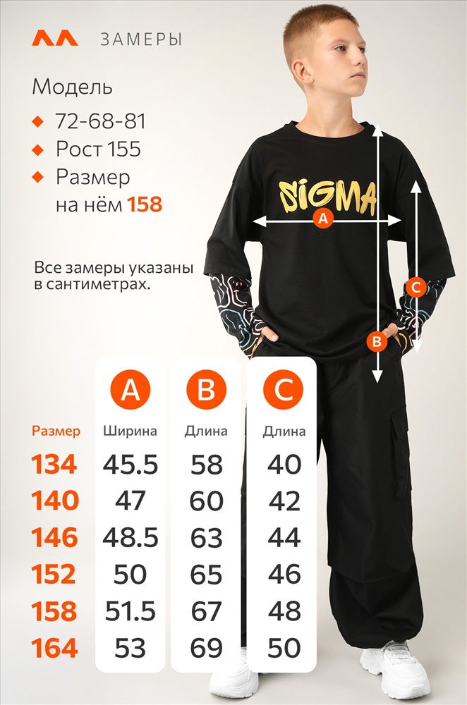 Модель Иван, его рост 155, параметры: 72-68-81. На нем размер 158.