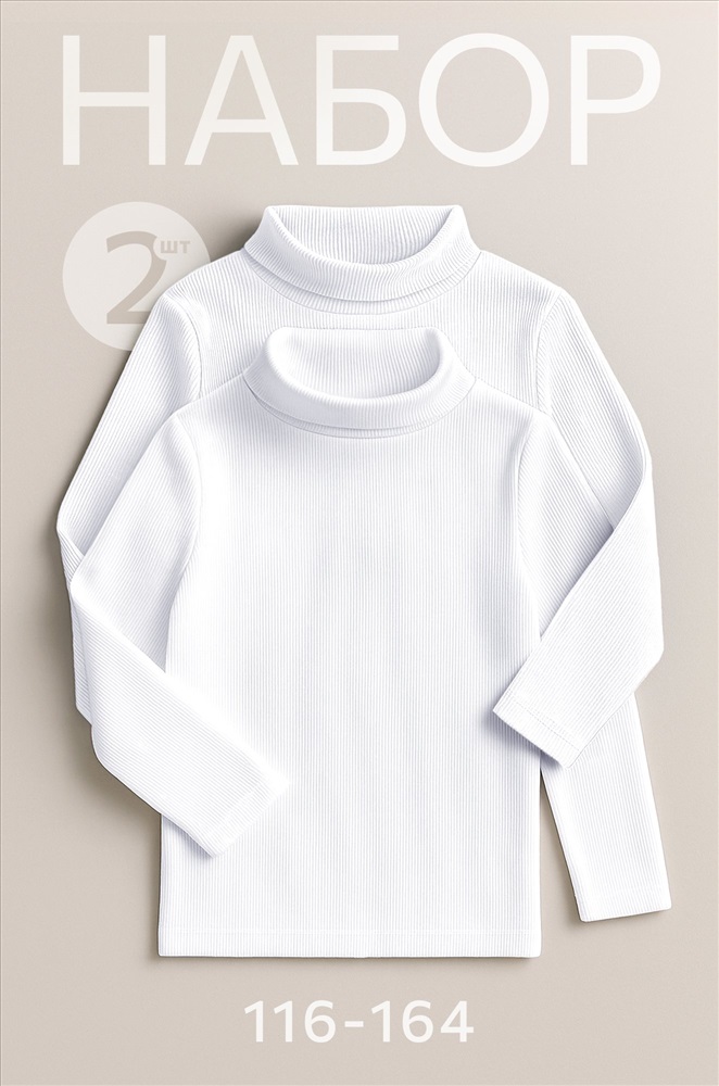 Преимущества: — натуральный хлопок с эластаном — мягкость, комфорт и долговечность; — фактурный трикотаж кашкорсе — приятная посадка по фигуре; — в наборе сразу 2 водолазки — практичное решение для повседневных образов; — прямой крой и длинные рукава — свобода движений на весь день; — высокий воротник-стойка защищает от холода и смотрится стильно; — белый цвет подойдёт и девочкам, и мальчикам; — детский бадлон универсален: подойдет для школы и для прогулок. Белая водолазка легко впишется в школьный гардероб. Базовая водолазка хорошо сочетается с любым низом и подойдет для многослойных образов. Модель Даша, ее рост 150 см, параметры 70-60-73 см. На ней размер 152. Модель Марк, его рост 157 см, параметры 75-72-87 см. На нем размер 158.