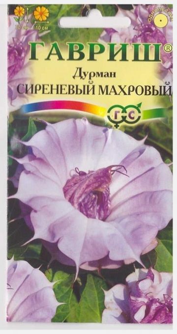 Это однолетнее растение прекрасно развивается в открытом грунте, достигая к августу высоты около 70 см при одновременном ежедневном распускании на каждом кусте до 12 огромных (до 20 см длинной) трубчатых махровых фиолетовых цветков с нежным приятным ароматом (особенно вечером в сухую теплую погоду). Отдельный цветок живет в раскрытом состоянии 1 сутки. Выращивается через рассаду и используется как декоративный летник. Плоды – колючие коробочки с большим количеством крупных семян. Дурман можно выращивать и в качестве многолетней кадочной культуры. Растение по тепло- и светолюбивости сходно с баклажаном, однако лучше выносит похолодания. Семена туговсхожие – могут всходить более 30 дней. Фасовка 15шт Комментарии к товару
