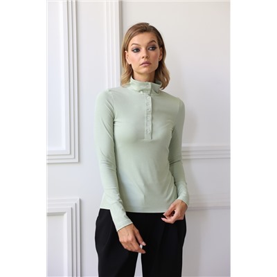 Джемпер с длинным рукавом приталенного силуэта. Высокий ворот с планкой и застёжкой на пуговицы до середины передней полочки изделия.