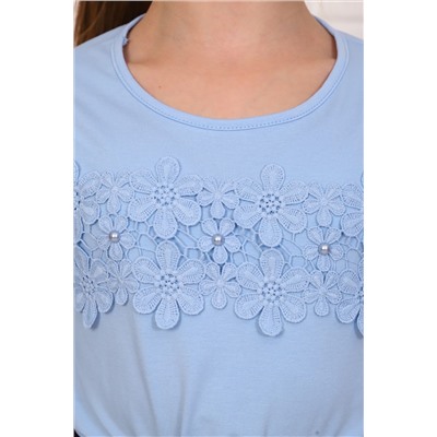 Джемпер для девочек дошкольного, младшего и старшего школьного возраста, из однотонного трикотажного полотна кулирка с лайкрой. Джемпер прямого силуэта, с втачным рукавом, без застежки. Спереди и на спинке отсутствуют линии членения. На передней части джемпера настрочено кружево по линии груди. Срез горловины обработан узкой окантовочной лентой из того же полотна в 4 сложения. Рукав одношовный, длинный. Низ рукава без манжеты, подогнут. На кружево приклеены 3 полубусины.