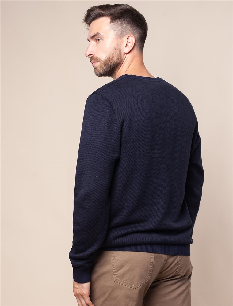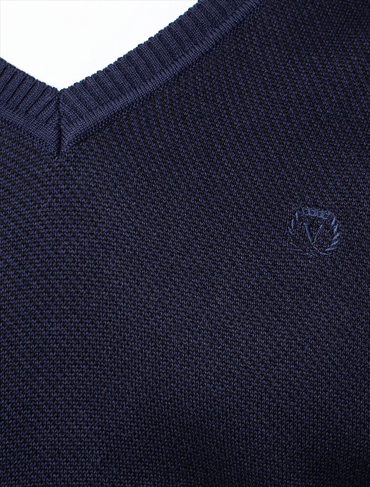Параметры модели на первом фото: Рост 190, бюст 111, талия 88, бедра 105 Для изготовления синего джемпера с клиновидным вырезом и длинными рукавами использовали пряжу из премиального хлопка с акрилом. У модели получилась очень мягкая и приятная на ощупь фактура из переплетения нитей нескольких цветов. Изделие комфортно носить даже на голое тело или дополнив образ футболкой. Роскоши вносит вышитый логотип бренда. Комментарии к товару