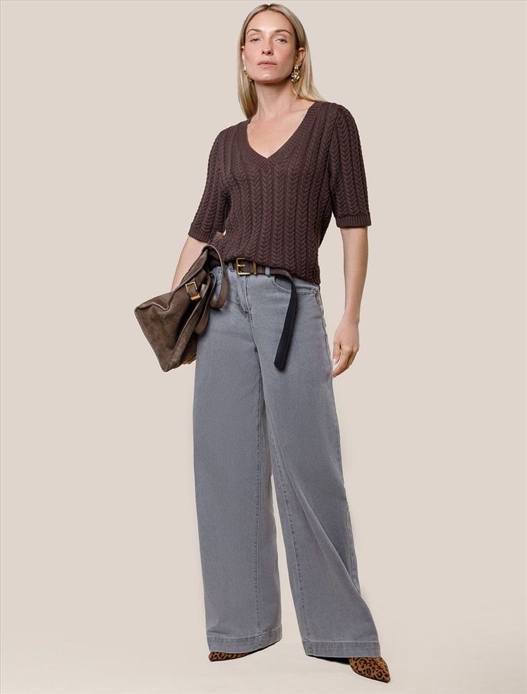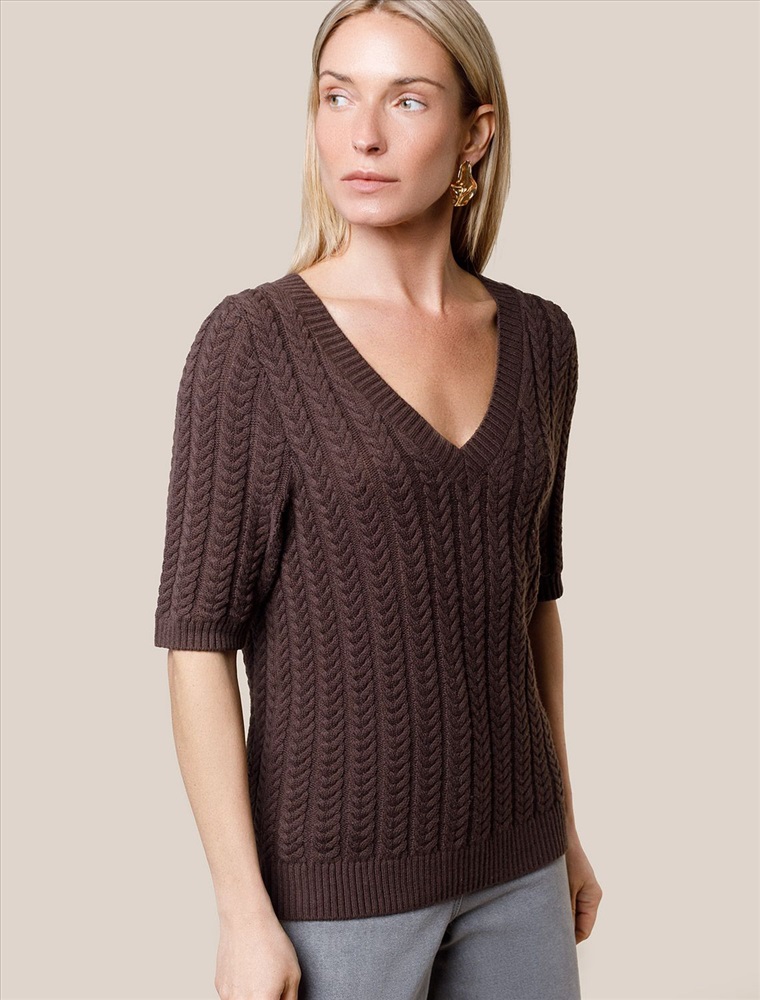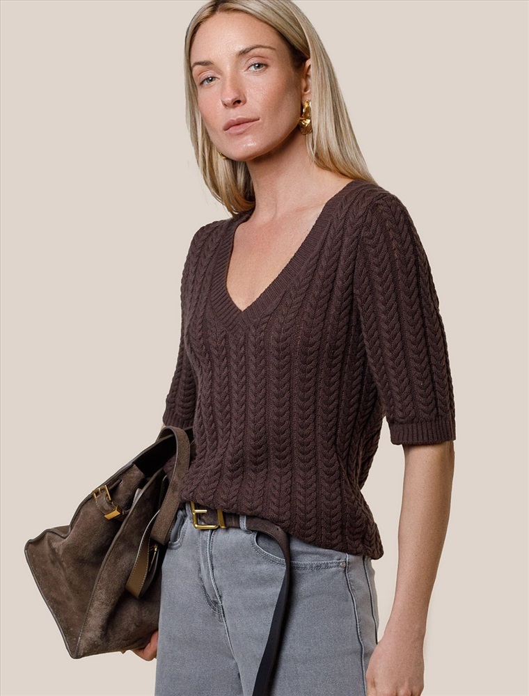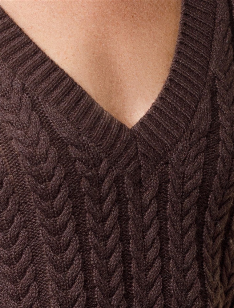 Размер товара на первом фото: 42 Джемпер фактурной вязки выполнен из хлопка с добавлением кашемира. Модель с V-вырезом с вывязанным орнаментом цепи. Мягкая и очень приятная пряжа совершенно не колется, сохраняет тепло при этом не перегревая, гарантируя безупречный комфорт.