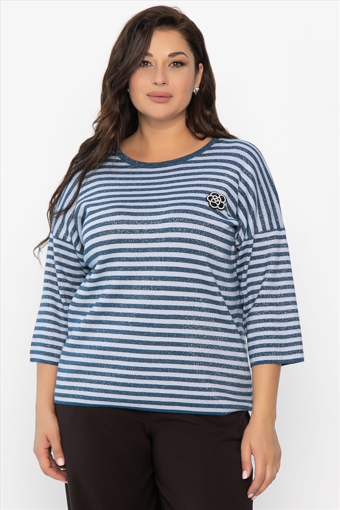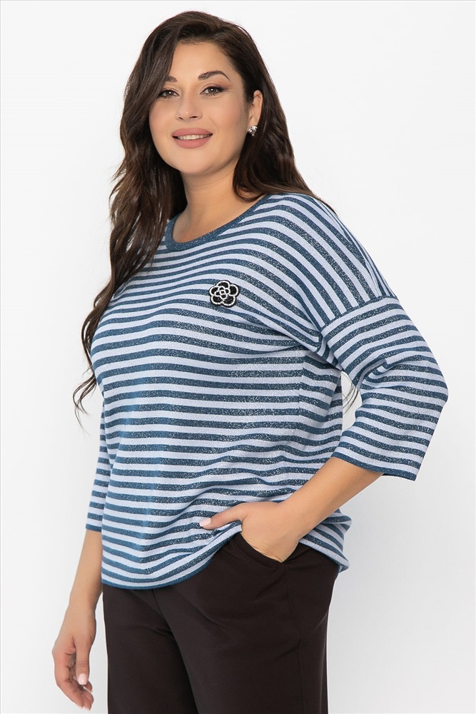 Универсальный джемпер с классическим полосатым принтом станет незаменимым элементом гардероба. Он изготовлен из трикотажа с добавлением люрекса, что придает ему особый шарм. На груди пришита небольшая аппликация из бисера, которая добавляет образу изюминку и завершенность. Этот джемпер идеально подходит для создания повседневных образов, сочетая в себе комфорт и современный стиль.