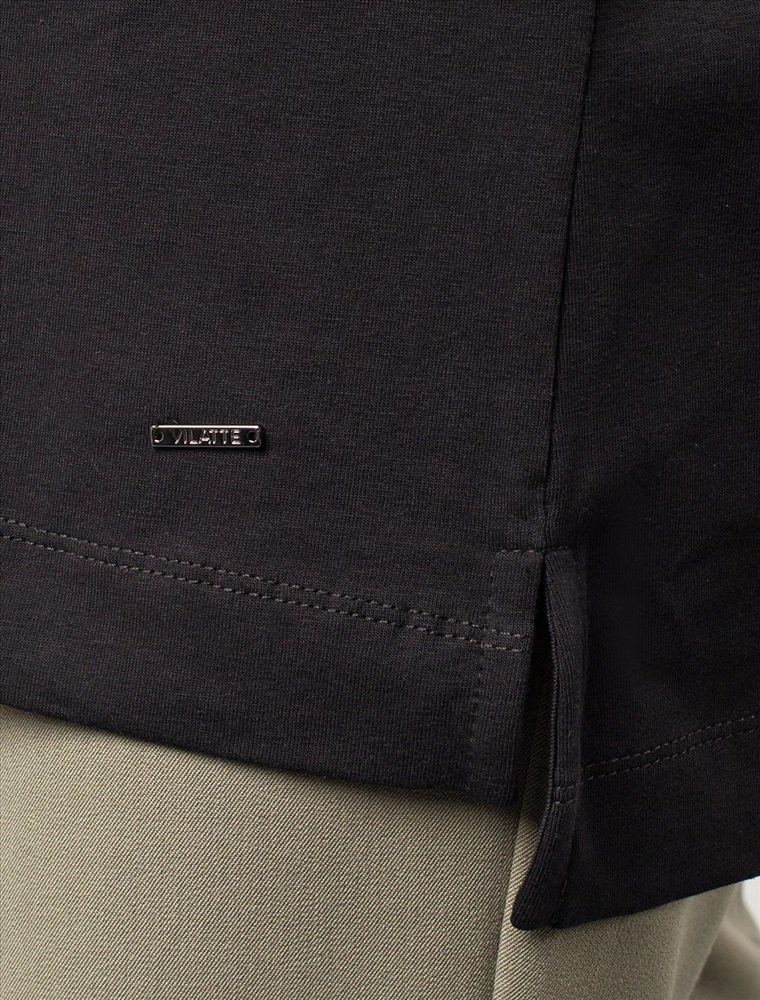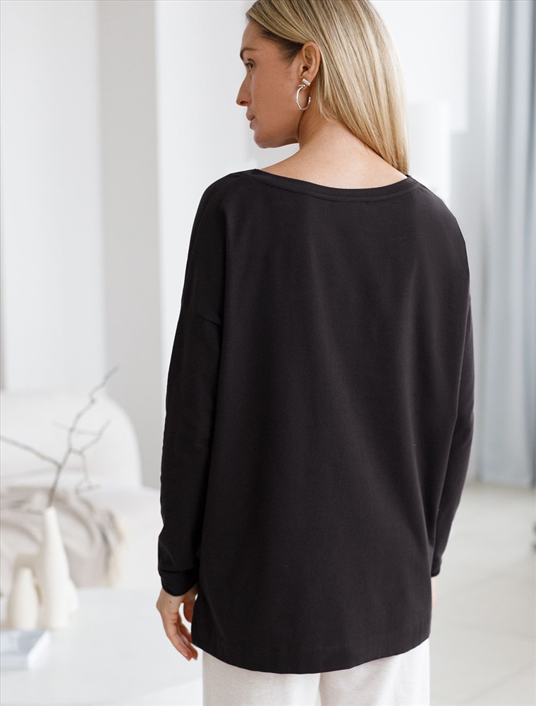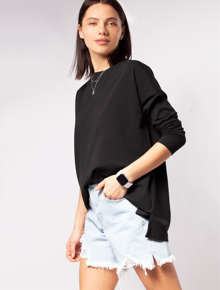 Параметры модели на первом фото: Рост 170, бюст 89, талия 63, бедра 92 Свободный базовый джемпер черного цвета с длинными рукавами и круглым вырезом сшит из премиального хлопка. Однотонная хлопковая модель хорошо поддерживает комфортный для тела микроклимат. Благодаря вплетению эластановых волокон вещь хорошо сохраняет форму. Подходит для любого типа фигуры.