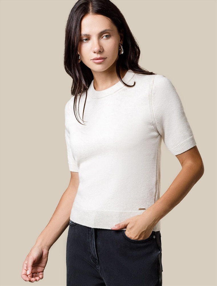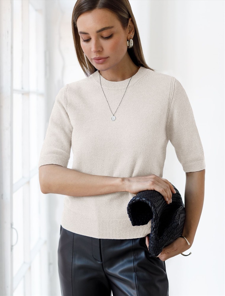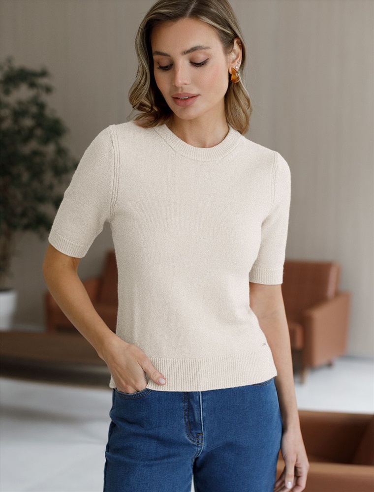 Плотность: 9 GG Размер товара на первом фото: 42 Джемпер с коротким рукавом выполнен из мягкой пряжи с кашемиром. Лаконичная модель с круглым воротом идеально сидит по фигуре. Благодаря своей универсальности подойдет для любого гардероба и в офисный дресс-код. Мягкая пряжа очень приятная к телу, поддержит комфорт на протяжении всего дня, при этом не перегревая. Сочетается в костюме с брюками D38.013, D38.012 и юбкой D36.016 Комментарии к товару