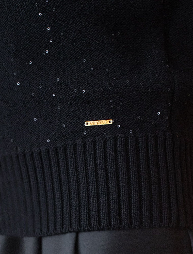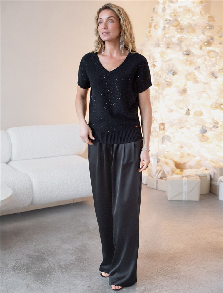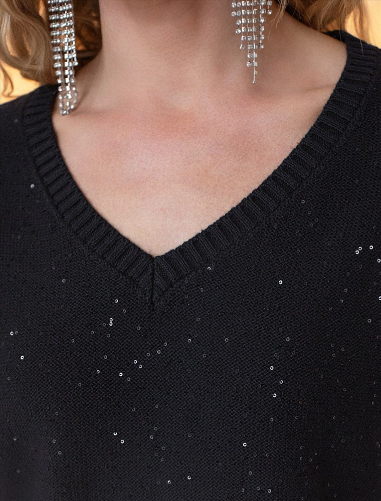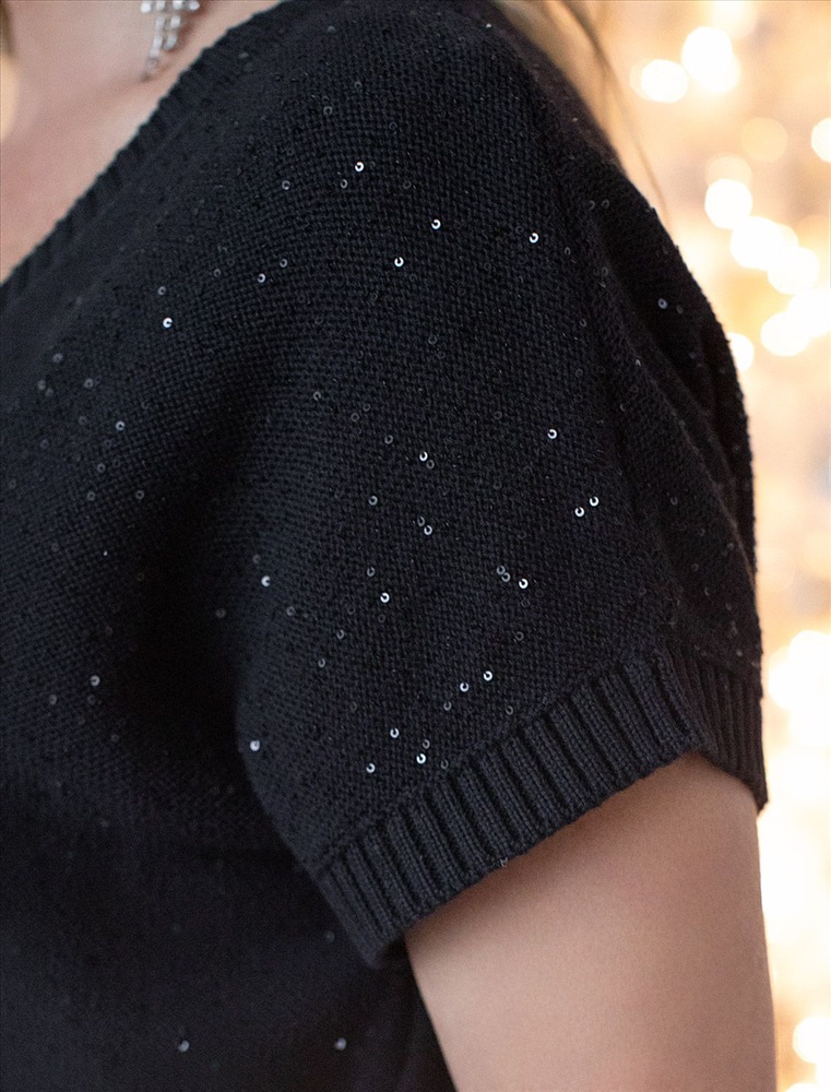 Плотность: 5 GG Легкий джемпер черного цвета с V вырезом и коротким рукавом выполнен из хлопковой пряжи с вкраплением сияющих пайеток, что придает особую изысканность. Нарядный джемпер связан изнанкой, пряжа отличается легкостью и приятной текстурой, совершенно не колется, обеспечивает комфорт даже при длительном использовании, а натуральные волокна поддерживают оптимальный температурный баланс. Свободный крой с эластичной манжетой по низу и цельнокроенный рукав создают расслабленый, но аккуратный образ. Умеренно открытое декольте вытягивает шею и подчеркивает ее изящество. Стильный джемпер подойдет девушкам и женщинам больших размеров, в нем вы будете чувствовать себя уверенно и свободно в любой ситуации. Блестящий эффект пайеток добавляет образу выразительности и индивидуальности. Мерцающее полотно добавляет особого шарма вашему образу, делая его уместным как на праздник, так и для повседневного выхода. Новый год, вечеринка или любое другое мероприятие пройдут ярко — сияющие пайетки создают ощущение праздника в каждом движении. Для спокойного повседневного аутфита добавьте к этому эффектному джемперу спокойный низ, близкий по цвету, без дополнительных элементов декора. Комментарии к товару