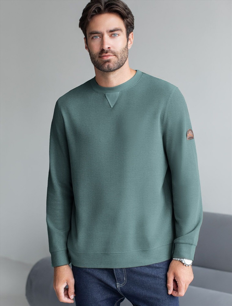 Плотность: 170 Г/м2 Легкий и невероятно комфортный джемпер изумрудного цвета создан для повседневного образа. Мягкий фактурный эластичный трикотаж приятно ощущается на теле, не сковывает движения и отлично подходит для носки в любое время года. Полуприлегающий крой обеспечивает свободу и удобство, позволяя выглядеть стильно и чувствовать себя уверенно каждый день. Круглый ворот украшен декоративной нашивкой в виде перевернутого треугольника, добавляющей оригинальности.. Манжеты на рукавах и по низу аккуратно оформлены, что придает завершенность внешнему виду и способствует сохранению формы джемпера после длительной носки и многочисленных стирок. На груди нашивка из экокожи в виде логотипа бренда, подчеркивающая индивидуальность каждого мужчины. Свободный фасон делает этот повседневный джемпер универсальным решением для разных типов фигуры. Эластичность материала гарантирует отличную посадку без ощущения стеснения. Джемпер легко сочетается с различными элементами одежды: от классических брюк до повседневных джинсов, позволяя создавать интересные комбинации на каждый день. Такой вариант подойдет для разных случаев: прогулок, встреч с друзьями или работы в офисе с нестрогим дресс-кодом. Благодаря легкости джемпер удобно носить в любое время года: он согреет в прохладную погоду и подарит ощущение свежести весной или осенью. Материал хорошо пропускает воздух, позволяя коже дышать даже при активном ритме жизни. Комментарии к товару