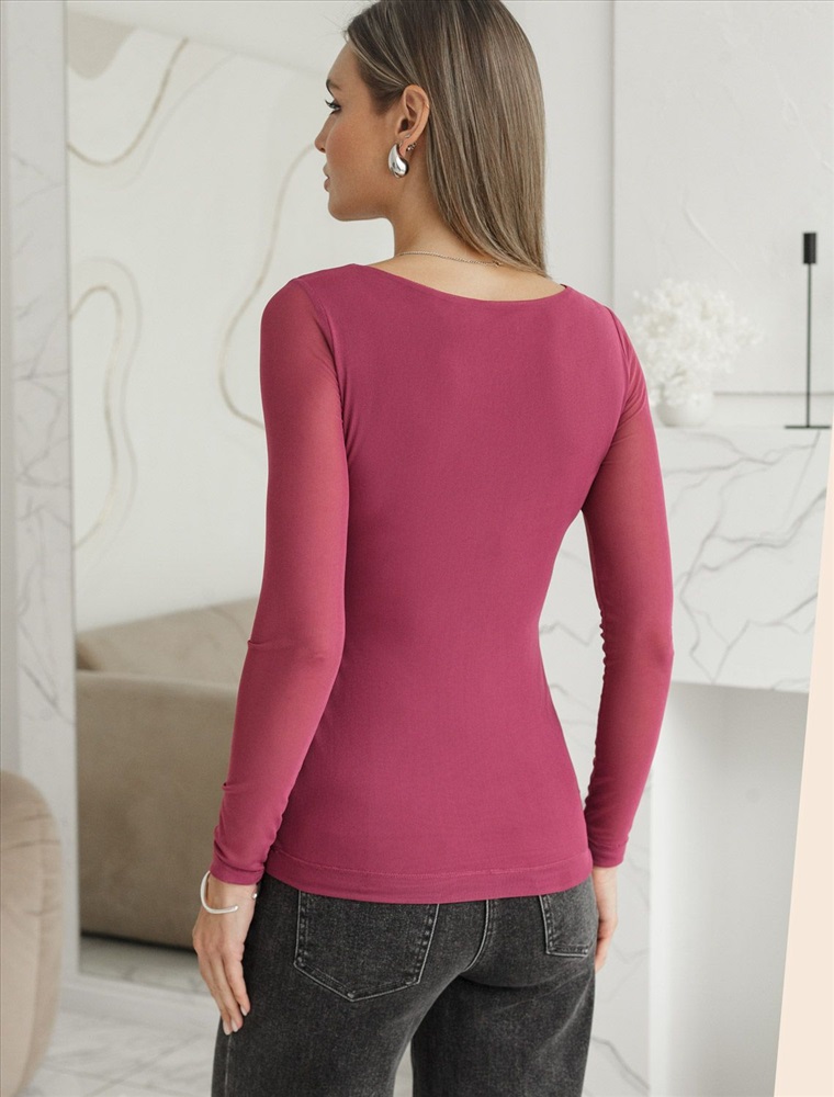 Плотность: 90 Г/м2 Джемпер с вырезом лодочкой и прозрачными рукавами создает женственный и элегантный образ. Тело джемпера лилового цвета выполнено из плотного вискозного трикотажа, обеспечивающего комфорт, в то время как рукава из тонкой сетки создают стильный контраст. Глубокий вырез лодочка подчеркивает линию плеч и создает элегантный силуэт. Идеальный выбор для стильных образов! Комментарии к товару