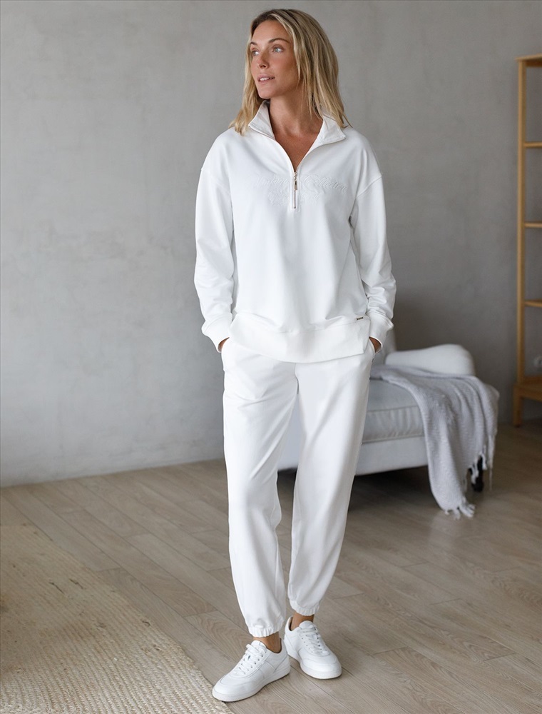 Уютный и комфортный вариант для прохладной погоды – стильный джемпер белого цвета с воротом на молнии. Изготовлен из премиального футера двухнитки с добавлением эластана. Материал сохраняет форму при длительном ношении и после многократных стирок, его мягкая текстура дарит ощущение уюта и тепла. Минималистичная вышивка в тон изделия в виде надписи. перевод надписи: Vinlage collection cotton club - Винтажная коллекция Хлопковый клуб. Свободный крой джемпера позволяет не ограничивать движения, что особенно важно для активного образа жизни. Подойдет на любую женскую фигуру, представлена широкая размерная линейка, большие размеры, легко комбинируется с другими вещами, создавая модные образы в стиле спорт-шик. Этот повседневный джемпер сочетает в себе удобство и актуальность, будет универсальным выбором для отдыха или прогулок.