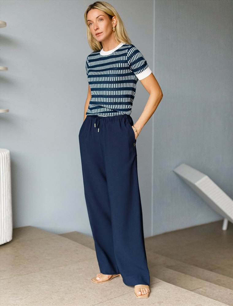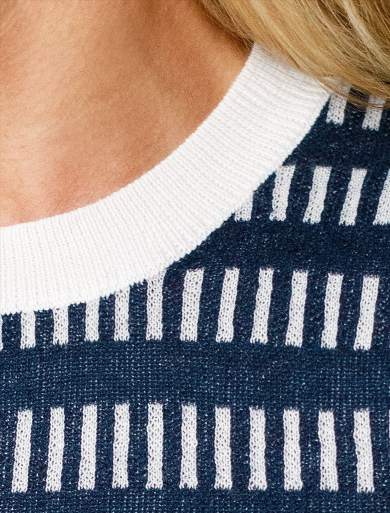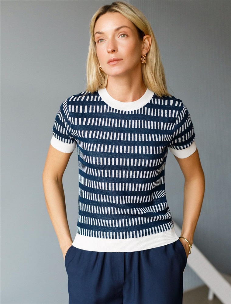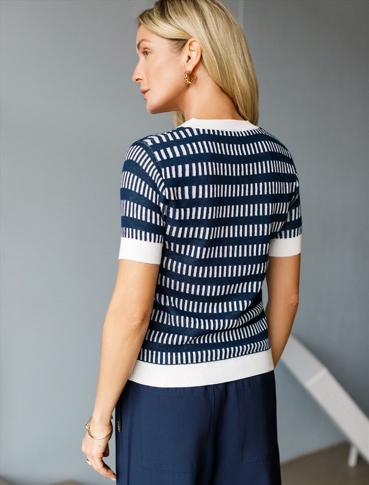 Плотность: 328 GG Топ тонкой вязки выполнен из полиэстера с добавлением вискозы. Вертикальный вывязанный принт визуально стройнит и вытягивает силуэт. Добавление в состав ПЭ способствует легкости и износостойкости изделия. Мягкая пряжа приятно ощущается на теле и дарит настоящий комфорт в теплое время года. Хорошо сочетается с белыми и синими низами поддерживая морской стиль Комментарии к товару