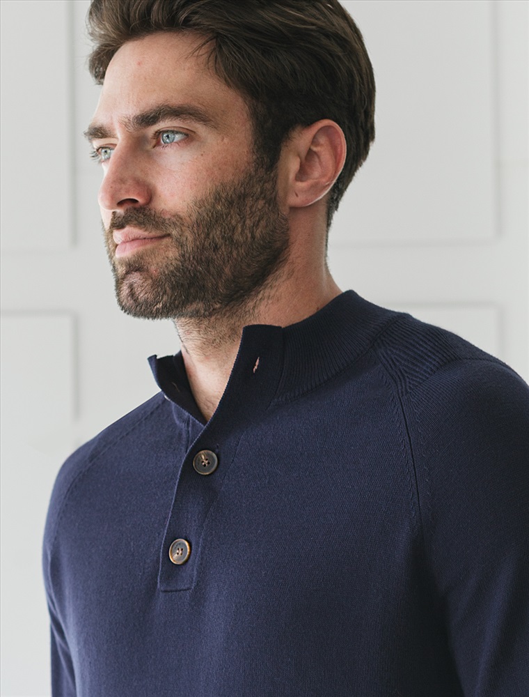 Параметры модели на первом фото: Рост 190, бюст 108, талия 87, бедра 104 Темно-синий джемпер с воротом, застегивающимся на черепаховые пуговицы, связали из мягкого хлопка с добавлением акрила; состав, который отлично согревает, не колется и при этом не перегревает тело, поэтому вещь получилась максимально комфортной для переменчивой погоды. Повседневный образ поддержат светлые брюки, синие джинсы и броги. Комментарии к товару