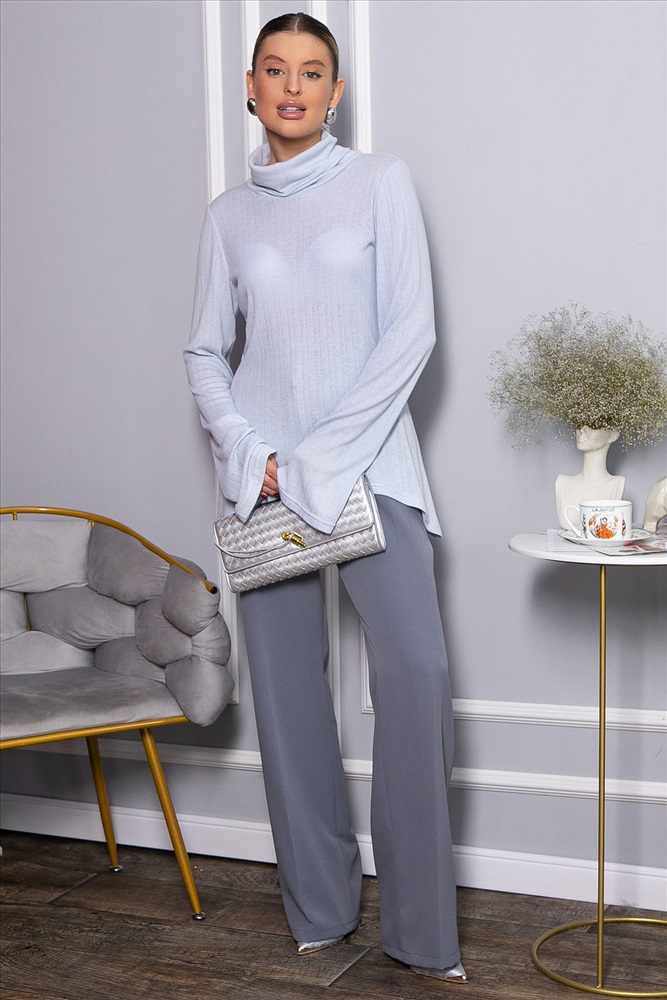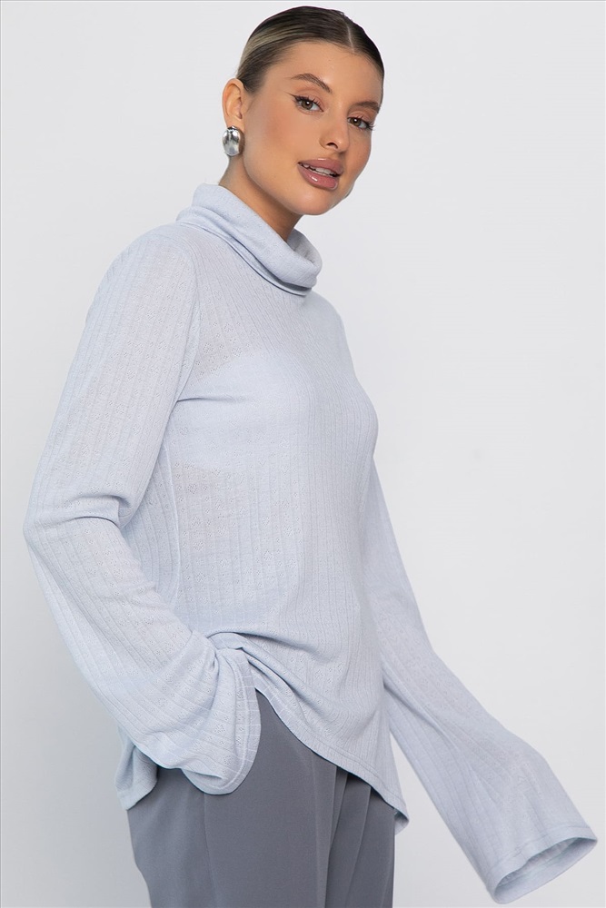 Ажурный трикотажный джемпер в нежно-голубом цвете — идеальный выбор для создания стильных повседневных образов. Модель с втачным удлиненным рукавом и воротником-хомутом придает современный силуэт. Асимметричный крой низа, с удлинением от центра к бокам, добавляет оригинальности. Ткань с перфорацией в виде сердечек придает образу нежность и романтичность. Создайте модные и комфортные образы с нашим новым джемпером!
