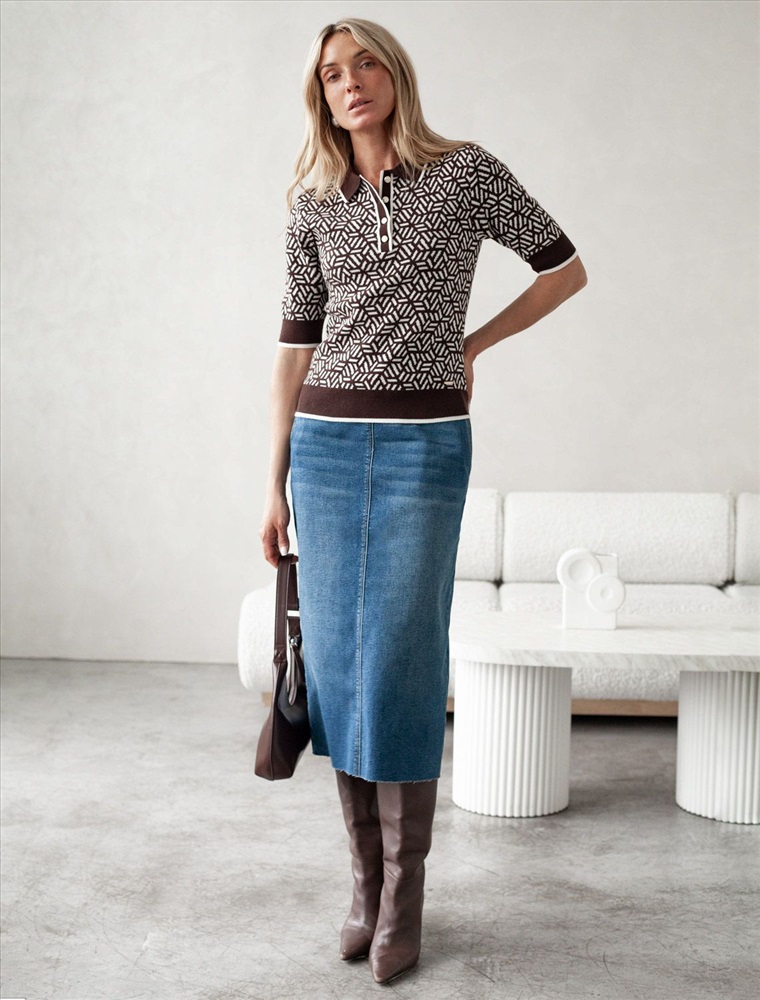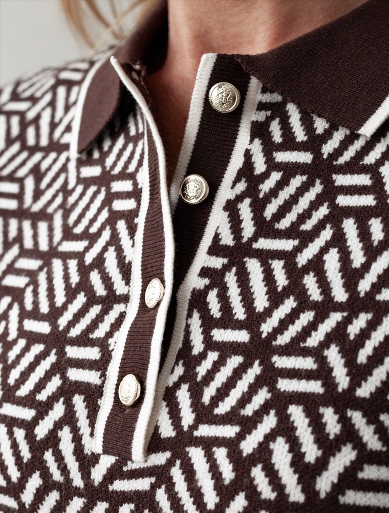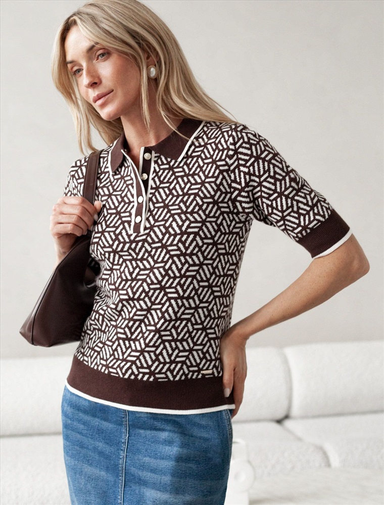 Параметры модели на первом фото: Рост 172, бюст 88, талия 64, бедра 88 Джемпер жаккардовой вязки выполнено из нежной пряжи на основе вискозы с добавлением кашемира. Модель прямого силуэта с застежкой планкой как у поло. Фигурные золотистые пуговицы вносят изысканности и роскоши. Изделие приятно ощущается на теле и поддерживает комфортный микроклимат. Сочетается в комплекте total-look с жакетом D31.150