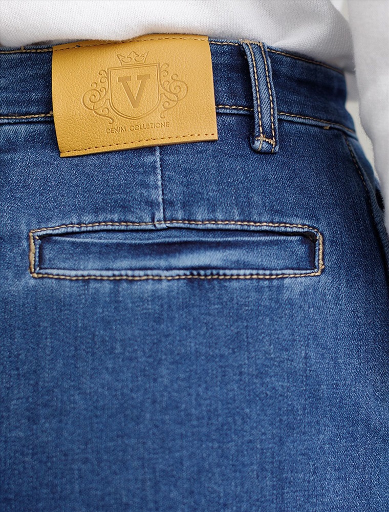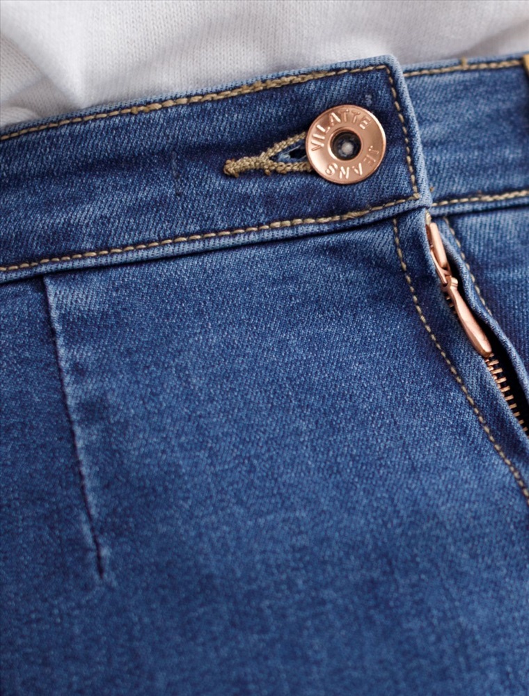Лаконичная джинсовая юбка красивого синего цвета из эластичного денима идеально подходит для создания женственного образа в любое время года, особенно в осенний период. Прямой фасон с высокой посадкой формирует аккуратный силуэт, подчеркивая достоинства фигуры и обеспечивая комфорт при ходьбе. Контрастные швы, отрезанный гладкий край понизу без подгибки и легкая декоративная стирка добавляют современности образу. Особенностью является разрез , который делает повседневную юбку более динамичной и удобной для прогулок или работы в офисе.
