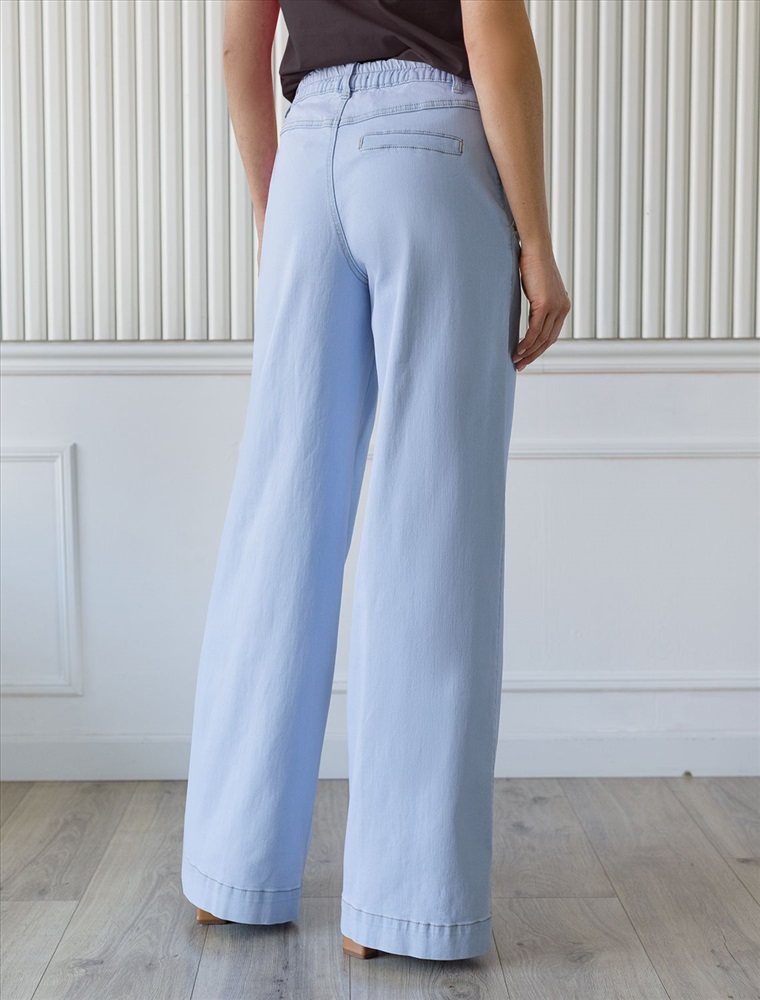Джинсы выполнены из эластичного денима. Модель свободного кроя с карманами как у классических брюк дополнена эластичной резинкой на поясе сзади. Этот удобный элемент позволяет комфортно фиксировать изделие. При желании можно вставить ремень, в изделии предусмотрены петли по периметру пояса.