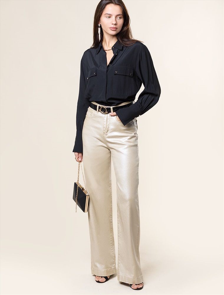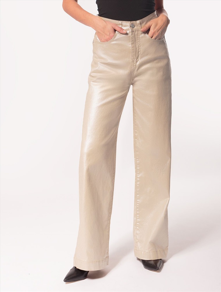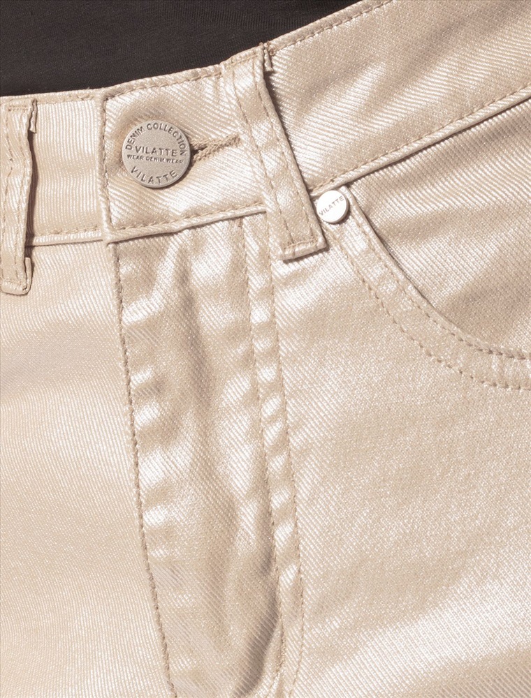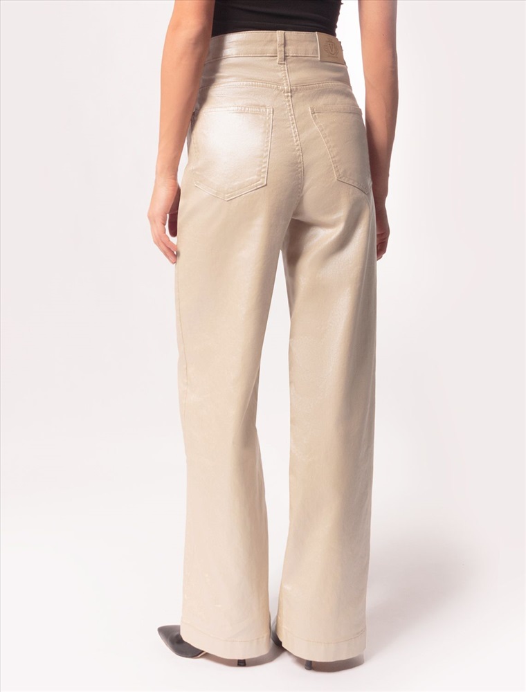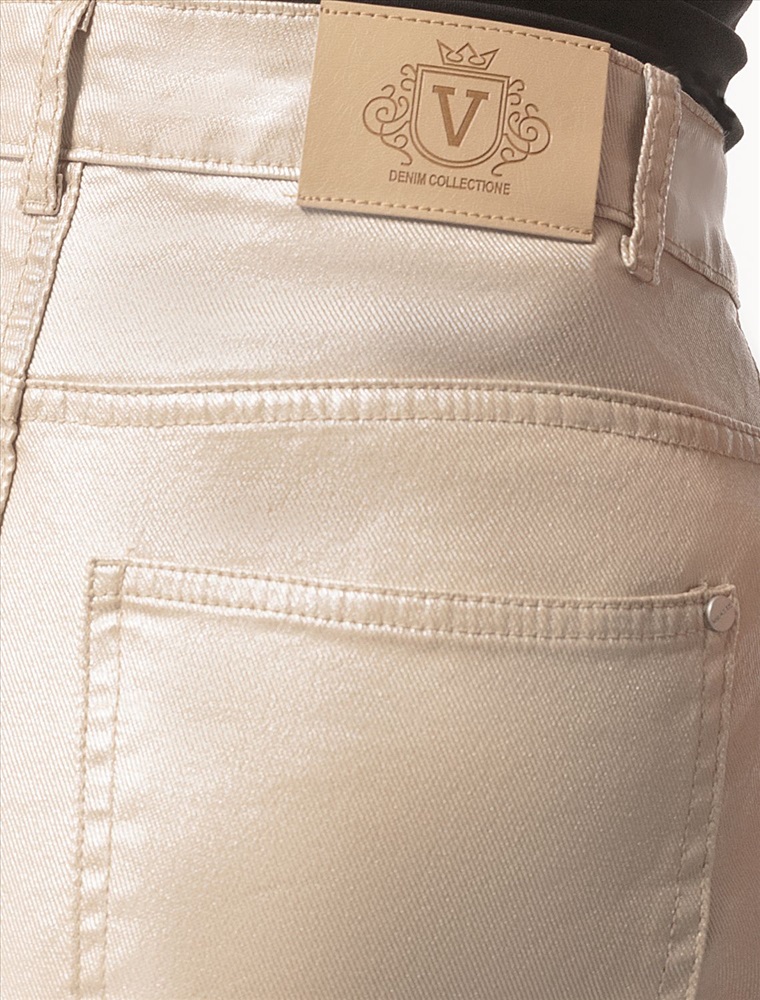 Параметры модели на первом фото: Рост 170, бюст 83, талия 64, бедра 88 Джинсы выполнены из эластичного денима с легким металлизированным покрытием. Супер-трендовая модель свободного кроя с высокой посадкой на талии. Цвет бежевой фольги с мягким жемчужным сиянием подходит любому цветотипу и сочетается со множеством других оттенков верхов. Плотная ткань хорошо держит форму не сковывая движений. Комментарии к товару