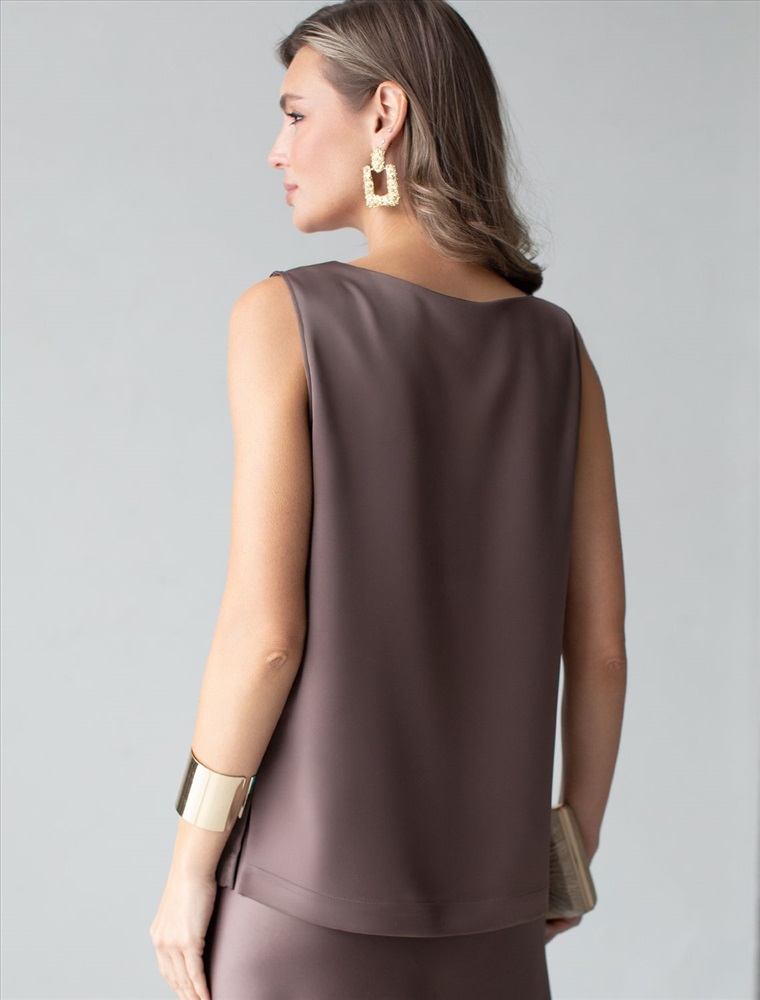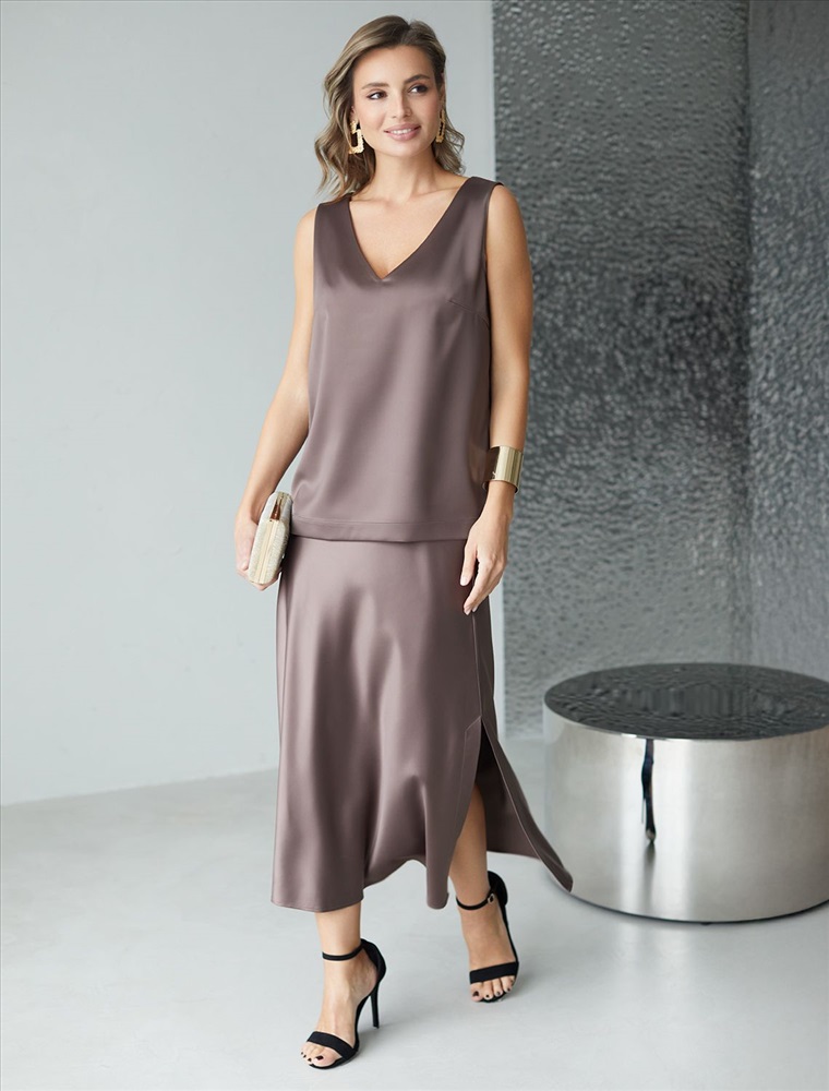 Плотность: 190 Г/м2 Изящный нарядный топ кофейного цвета с V вырезом выполнен из нежного премиального сатина с небольшим добавлением эластана. Свободный крой обеспечивает комфорт, легкость и свободу движений, подчеркивая изысканность образа и женственность силуэта. Особое внимание привлекает мягкий приглушенный блеск материала, придающий топу дорогое и утонченное звучание. Материал отличается приятной текстурой и долговечностью, что гарантирует долгий срок службы топа. Благодаря струящейся, но плотной ткани, топ мягко ложится по фигуре, придавая легкость и подчеркивая достоинства любого типа фигуры. Приятная на ощупь текстура и хорошая воздухопроницаемость - делает повседневный топ отличным выбором для теплого времени года или для носки в помещении. Топ подойдет как на большие размеры, так и на маленькие — универсальность фасона позволяет чувствовать себя уверенно вне зависимости от комплекции. Декольте оформлено аккуратно, создавая эффектный акцент без излишней открытости. Этот топ идеально подойдет для создания стильного ансамбля на вечерние мероприятия или важные события. Благодаря сочетанию элегантности и практичности, такая стильная блузка без рукавов станет незаменимой частью гардероба для женщин, которые ценят качество и комфорт в одежде. Благородный блеск сатина добавляет нотку роскоши в повседневный гардероб и гармонично сочетается с разными стилями одежды: офисными брюками, джинсами или юбками. V-образный вырез визуально вытягивает шею и создает элегантный акцент в зоне декольте, делая образ более открытым и современным. Комментарии к товару