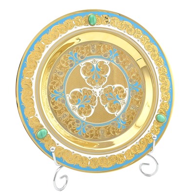 Каждое изделие в этом наборе выполнено мастерами вручную с применением традиционной технологии Златоустовской гравюры, включая травление, гравирование, рисовку иглой, никелирование, покрытие золотом, эмалью и даже камнерезные работы. Поднос украшен изысканными вставками натурального малахита, добавляя изделию особой элитарности и утонченности.