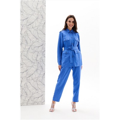 Страна производитель: Республика Беларусь Комплектация: Брюки, Блуза Сезон: Лето Коллекция: Лето, Лето 2023 Стиль: На каждый день Цвет: голубой Материал: лен Состав: Лен - 53%Вискоза - 47% Рост: 164 см Описание: Комплект женский, двухпредметный (блузка+брюки) из костюмно-плательной ткани. Блузка прямого силуэта, длиной ниже линии бедер. Перед с нагрудными вытачками, притачной центральной планкой и застежкой на петли, пуговицы, накладными объемными верхними карманами с фигурными клапанами и застежкой на петлю, пуговицу, с накладными нижними карманами и фигурными клапанами с застежкой на петлю, пуговицу. Спинка с отрезной кокеткой и бантовой складкой в шве кокетки. В боковых швах блузки разрезы по низу. Рукав одношовный, втачной, длинный, с разрезом и притачной манжетой, с застежкой на петлю, пуговицу. Воротник рубашечный с отрезной стойкой. Блузка со шлевками и поясом с блочками из основной ткани и обтяжной пряжкой. По плечам имеются декоративные погоны на пуговице. Брюки прямые. Перед с застежкой на молнию, талиевыми вытачками, функциональными боковыми карманами с отрезным бочком. Задние половинки брюк с талиевыми вытачками. Брюки на притачном поясе с резинкой по бокам для лучшего прилегания и шлевками. Комментарии к товару