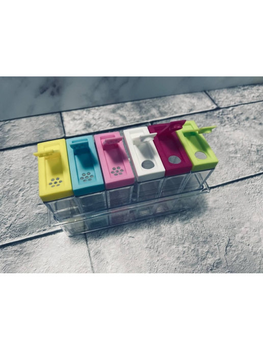 Набор для специй состоит из 6 прозрачных пластиковых боксов с разноцветными крышками и подставкой для удобства хранения У каждого контейнера 2 вида выходных отверстий: 3 маленьких отверстия для порошковой приправы, 3 больших отверстия для больших частиц приправы. Баночки легко открываются и легко закрываются, для ежедневного использования. Пропускающий свет корпуса банок позволит легко различать приправы. Они изготовлены из полипропиленового материала, здорового и экологически чистого, с гладкой поверхностью. Вы можете использовать каждую емкость по отдельности, а можно собрать их в единый контейнер, который идет в комплекте. В наборе поднос с ручкой, с помощью которого набор легко переносить и хранить. Преимущества набора банок для специй. Удобно хранить и использовать приправы и специи; Плоские банки выгоднее круглых, так как занимают меньше места; Простота использования; Современный интересный дизайн; Съемные крышки для легкой очистки;