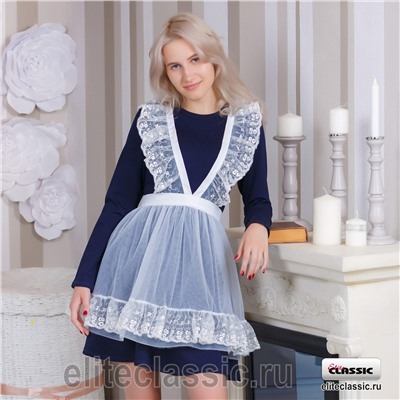 Изящный, воздушный фартук из сетки и фатина с отделкой из кружева. Фартук с отрезным поясом, без грудки, по бретелям оборки из кружева. Передник со сборкой по талии двухслойный. Низ отделан кружевом.